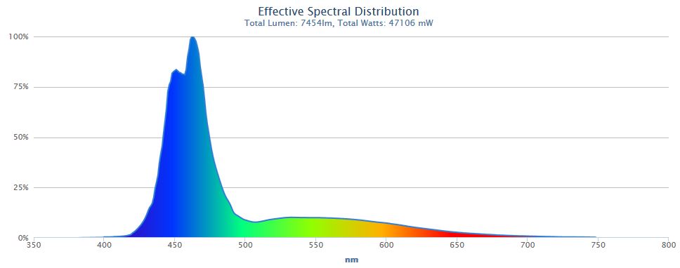 Ich hänge das Spektrum, das ich aktuell eingestellt habe und an. Hier sind auch schon die Ströme berücksichtigt (also inkl. Dimmung).Jörg Kokott hat geschrieben:Wegen der Lampe nochmals: PAR ist ja nur eine Intensitätsangabe und sagt nichts über das Spektrum aus. Das ist immer das Problem bei solchen Messungen. Das Spektrum der Lampe kannst Du ja mal hier reinstellen, das hab ich auf der Seite nicht gefunden bzw. keine Ahnung, wo man danach sucht. Aber hier muss man ja auch schauen, wie die Lampe relativ zu dem Spektrum bei Dir eingestellt ist.