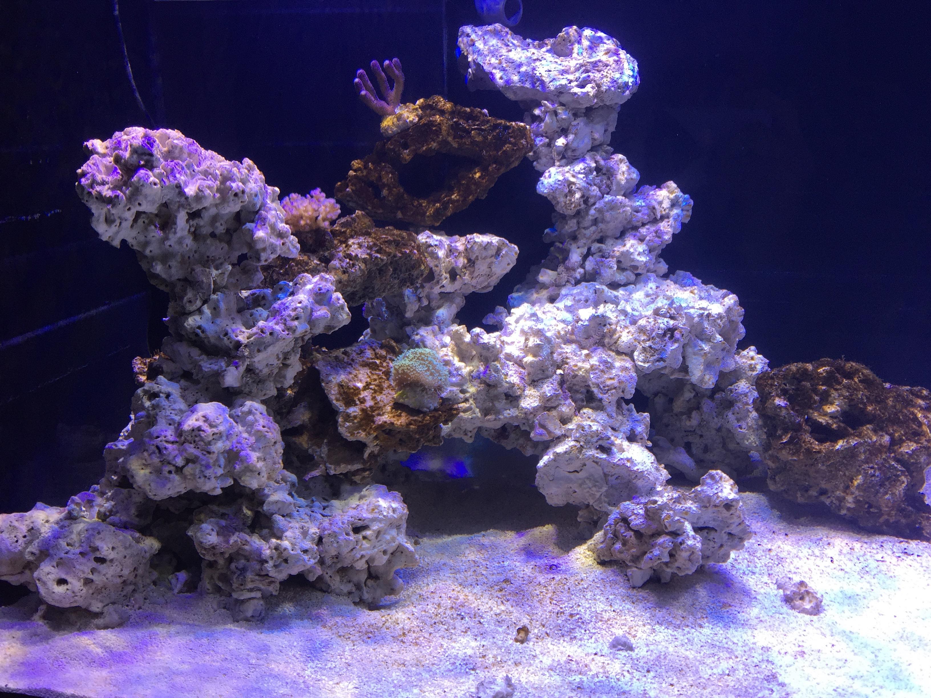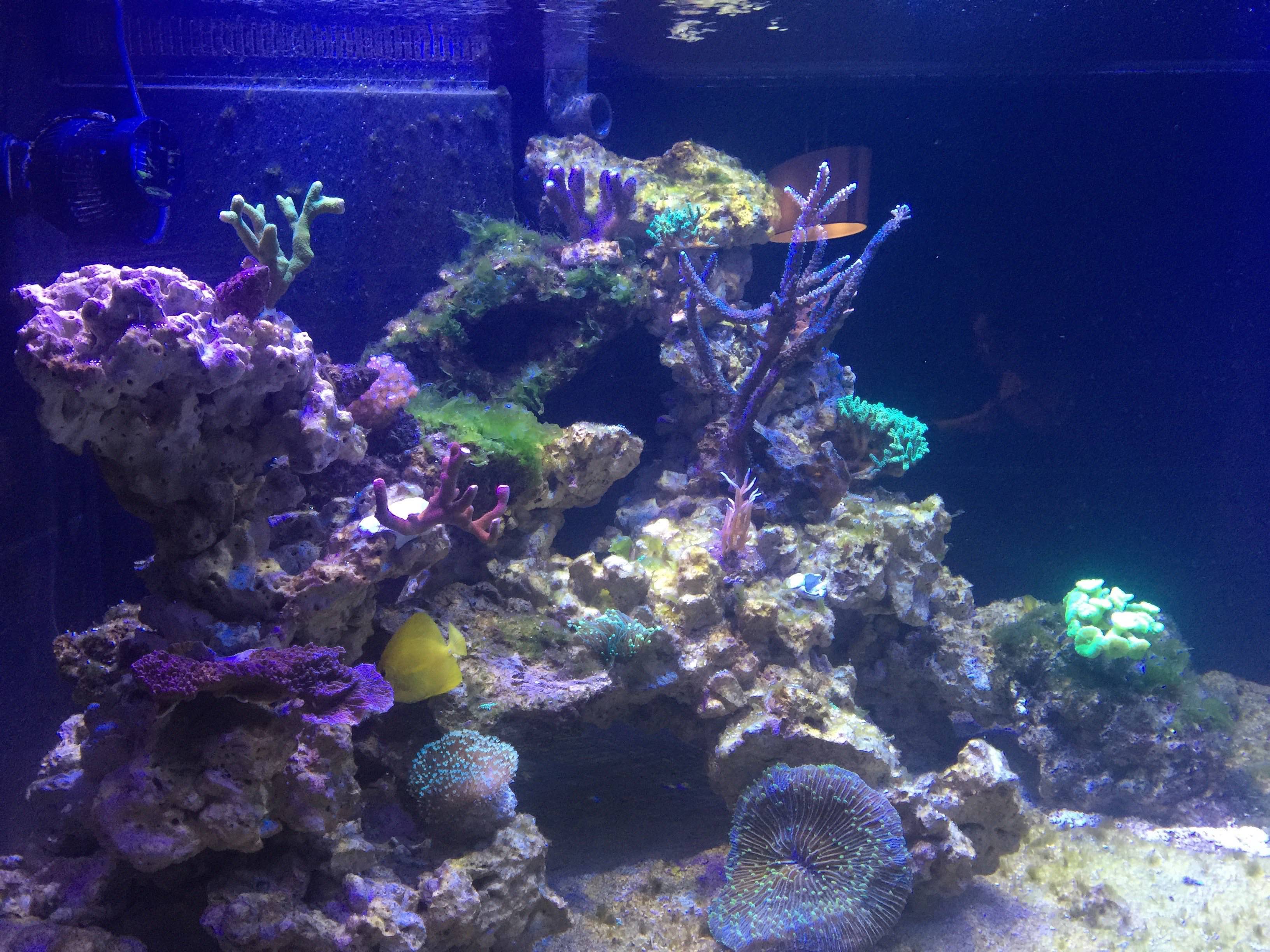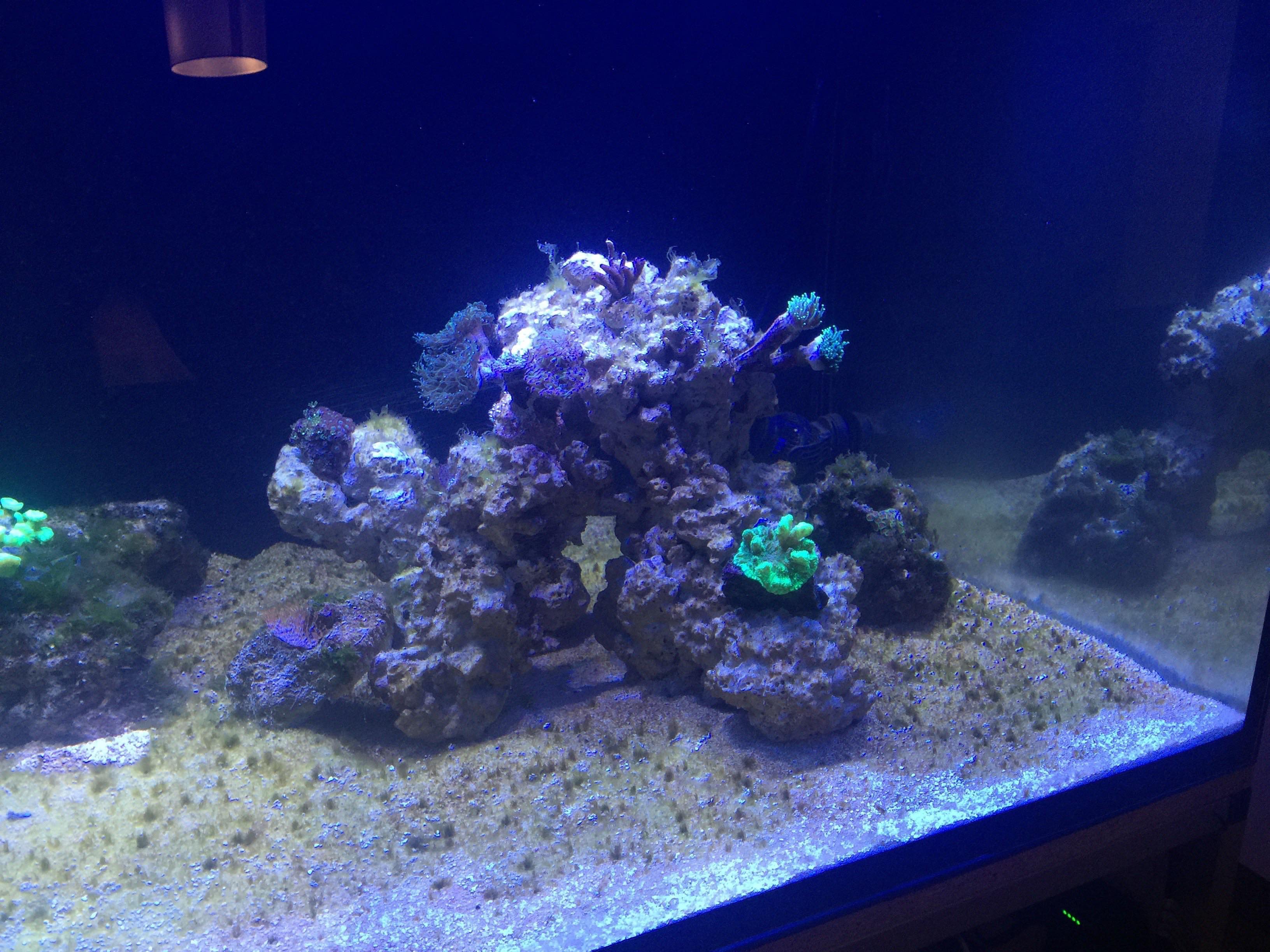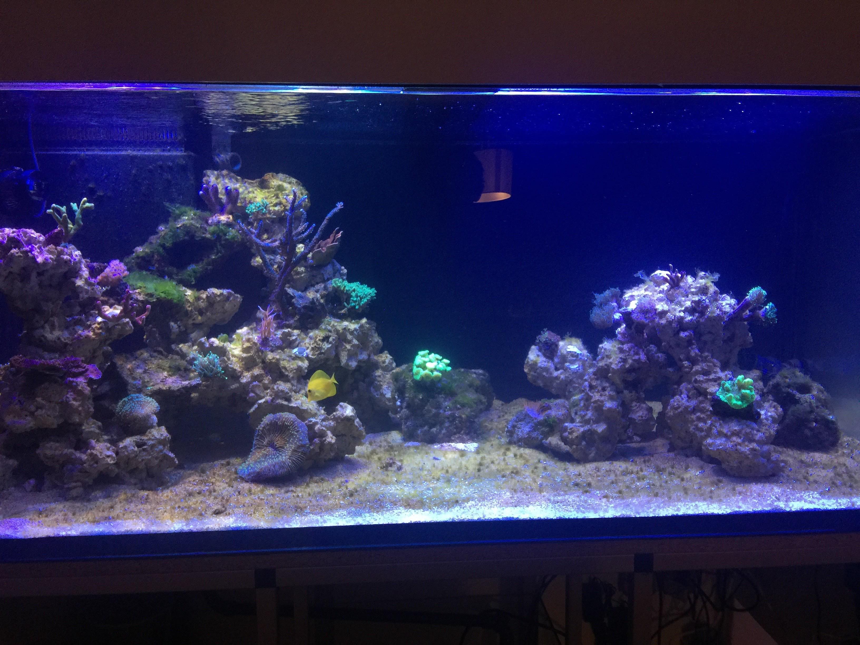 Hallo, wieder mal ein kleines Update von meinem Becken. Ich befinde mich in der 3. Woche mit Sangokai und das Becken steht gut da alle Korallen schön geöffnet. Momentan breiten sich überall Algen aus, um diese kümmern sich jetzt Schnecken, Einsiedler und 2 Zebrasoma Flavescens. Momentan Dosiere ich auch wieder Nutri Complete da No3 und Po4 nicht nachweisbar sind, aber auch durch den Besatz mit den 2 Docs sollten Nährstoffe ins Becken kommen.