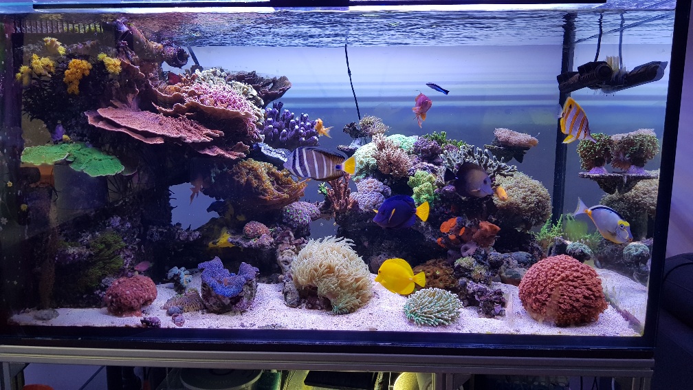 Beleuchtung : 8 x 54 Watt Sunpower (4 x Blue plus, 2 x Aquablue spezial, 2 x Coral plus) täglich 10,5h / Morgens und Abends je 15 min. Blaulicht
