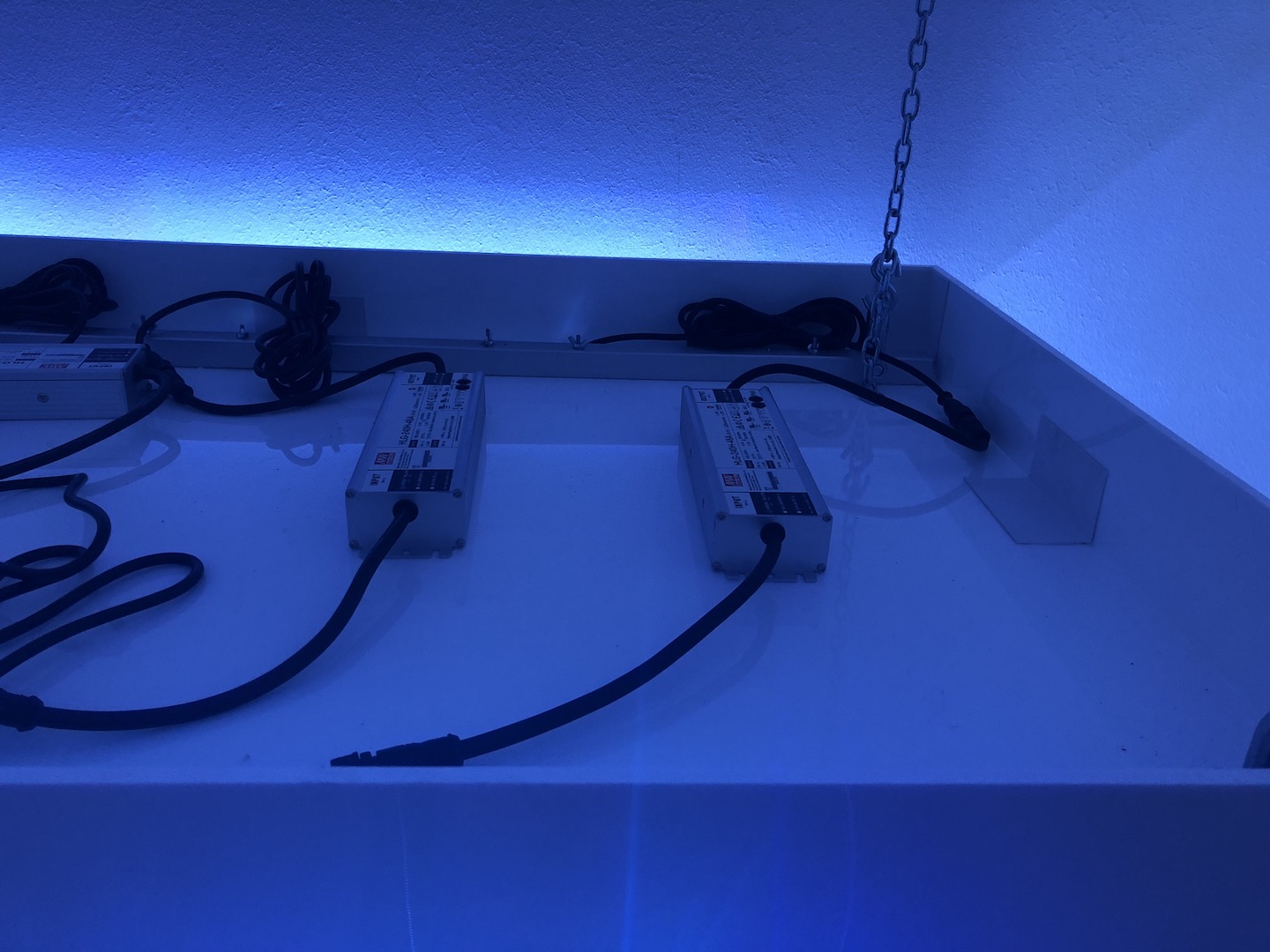 In dem Rahmen liegen 2 Aluprofile die Orpheks sind mit Gewindestangen von unten durch das Plexiglas und durch die Aluprofile verschraubt. Zwischen Leuchte und Plexiglas habe ich 5cm für den Luftstrom gelassen und die Gewindestangen mit weissen Kundstoffrohren verblendet. Alle Kabel wurden oben reingelegt .