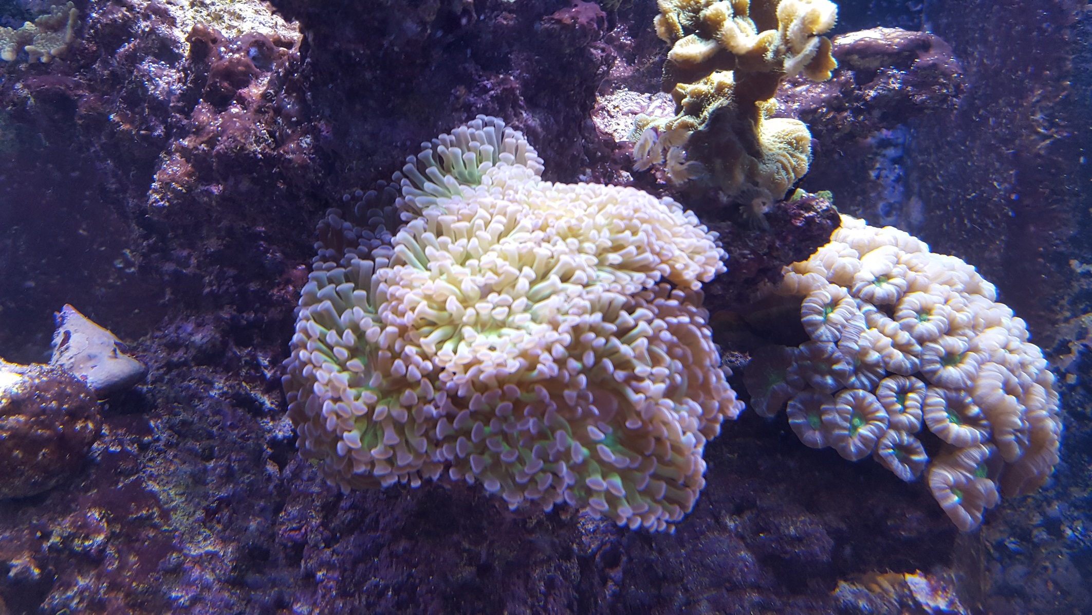 Cyanos gehen weiter zurück, die Korallen zeigen Polypenbilder wie nie zuvor, was ich in erster Linie dem Wechsel auf das Balance System zuschreibe. Selbst die geschädigten Korallen erholen sich und überziehen die abgestorbenen Skelette wieder mit Gewebe. Habe einige neue Korallen letzte Woche ins Becken gesetzt (hierzu vielen Dank an Claudia vom nano-Riff). Die neue Acro zeigt ein wunderschönes Polypenbild.