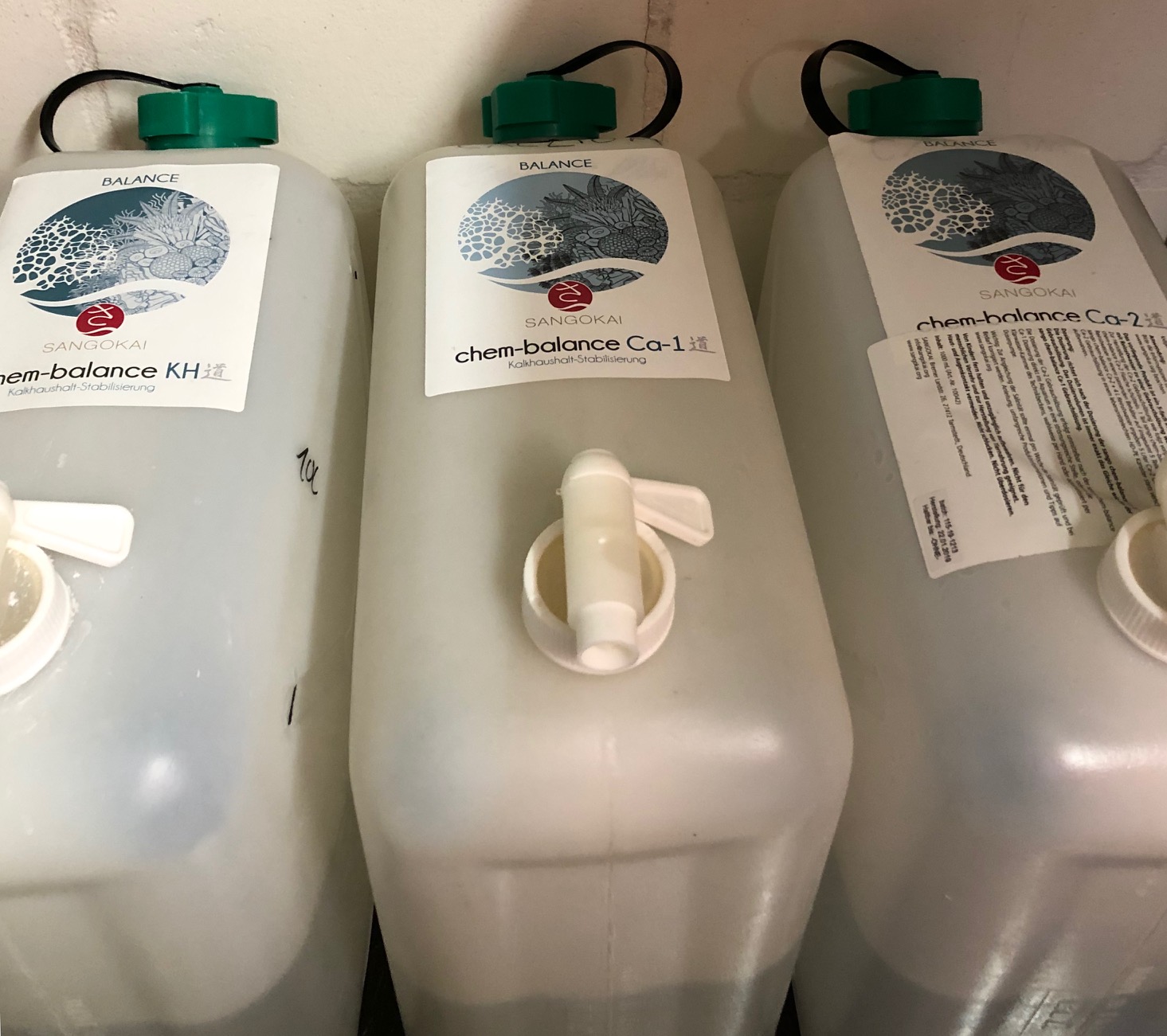 Das Becken läuft in einem Mix aus BL mit Traces und Sangokai Basis Hälfte der Dosen und 40Liter WW die Woche mit pro Reef.