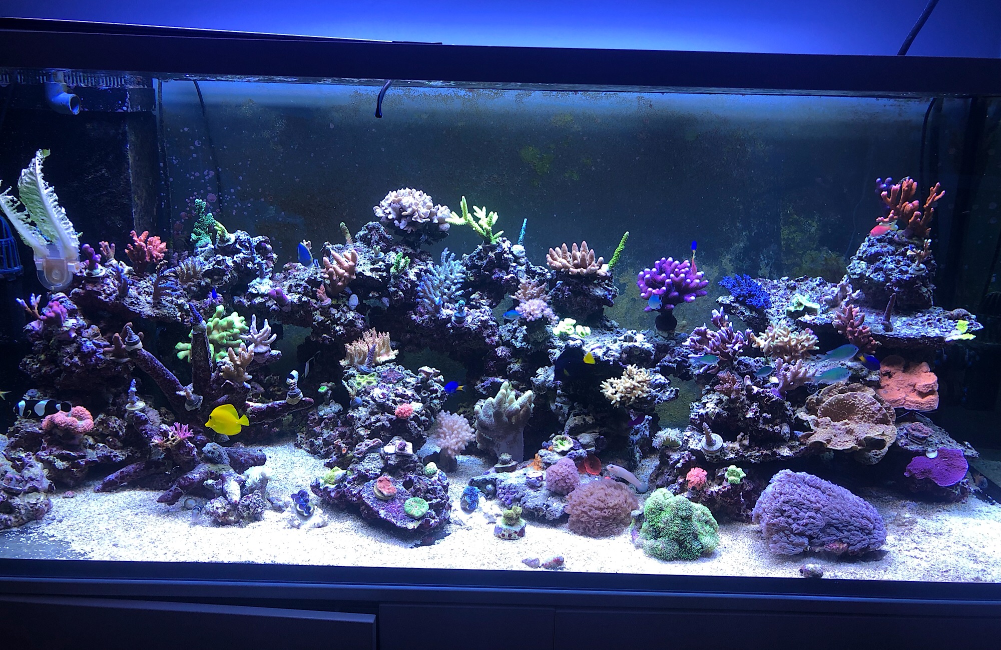 Wollte mal ein kurzes update geben zu meinem Becken, es läuft jetzt seit dem 17.Nov 2018 und es entwickelt sich sehr gut ( Meiner Meinung nach ). Nachdem ich jetzt eine kurze phase mit sehr wenig Nährstoffen zu „kämpfen“. Seit ein paar tagen scheint es sich zu bessern, Nitrat und Phosphat ist immer noch n.n., aber die Korallen stehen um einiges besser da. Es sind weiter div. Korallen und Fische dazu gekommen, man glaubt gar nicht viel Korallen in den „Pott“ rein gehen :lol:. Anbei noch ein paar Bilder-