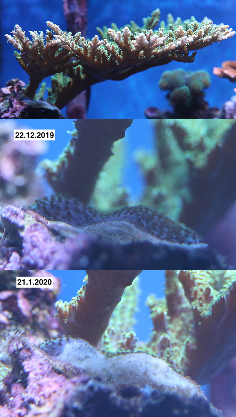 mal wieder ein Update - prinzipiell läuft es jetzt ganz gut. Ich habe keine weiteren Totalverluste, allerdings gehts meinen Acroporen weiterhin nicht sonderlich toll. Sie zeigen zwar ein ordentliches Polypenbild, bei meiner grossen Tisch-Hyacinthus zieht sich aber die Basalscheibe zurück: