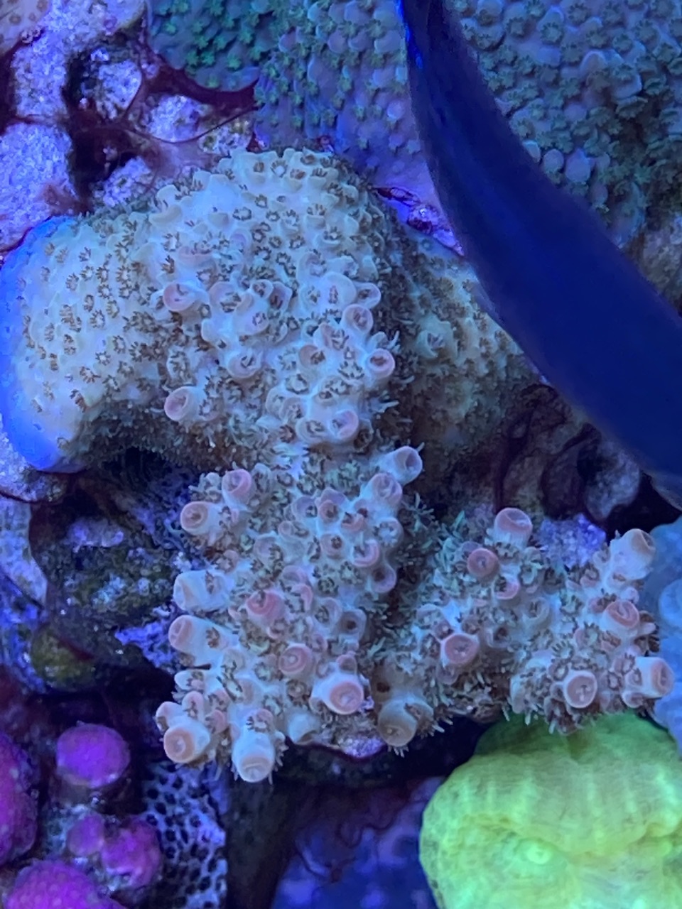 Heute war der dritte Tag mit der doppelten #1 Nano-Basic…das Wasser wurde heute etwas trüber, eventuell durch Bakterioplankton, und die Polypen waren mehr eingezogen, die grüne Hornkoralle auf der Rückwand ging widerwillig auf…
