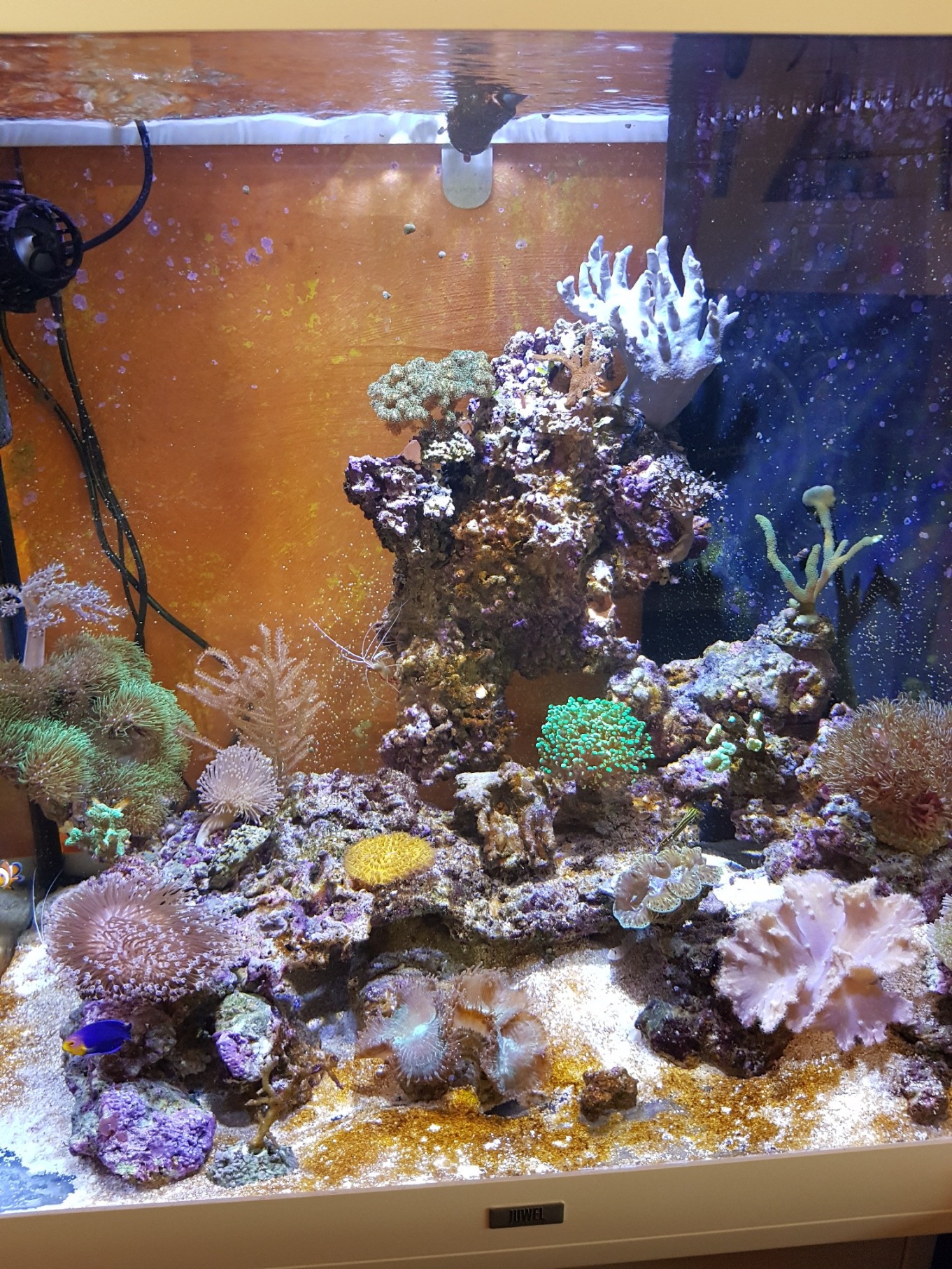 „Tiere“: 2xClownfische, 1xHector’s Grundel, 2xFridmani, Randall Partnergrundel mit Knallkrebs, 2x Zwergkaiser (argi), Grabender Seestern, Seeigel, 2xPutzergarnelen, Wurdemanni Garnele