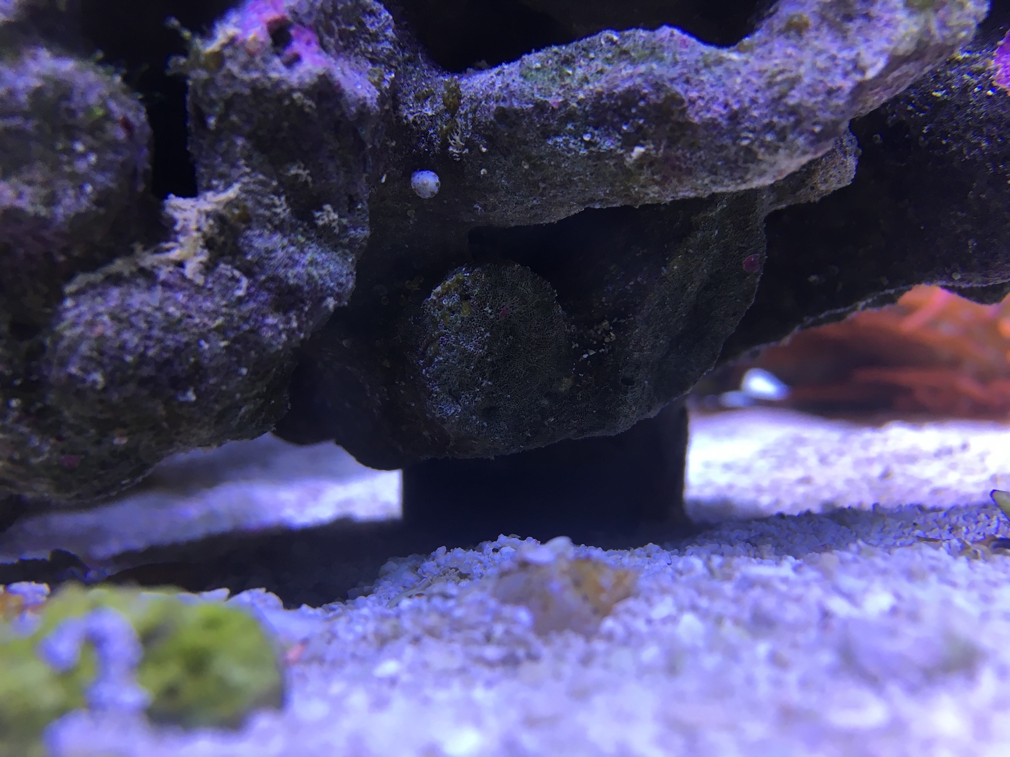 - Grabender Seestern, drei strombus-Schnecken und diverse Nassarius, sowie astralium calcar (ausnahmslos im Gestein unterwegs) und tectus (ausnahmslos aud der Rückscheibe). Zwei Snakehead-Kauris, die fleißig Gelege produzieren, eine mithrax-Krabbe und eine eingeschleppte Krabbe mit schwarz-weiß geringelten Beinen und schwarzem Körper.