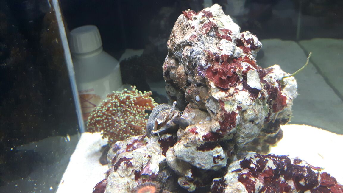 Des weiteren sind 1 zoanthus, 1 euphyllia, 1 rhodactis und 1 ricordea vom großen Becken ins nano umgezogen, um ein paar gescheite Bakterien einzubringen. Den Korallen geht's sehr gut. 1 bodenschnecke, auch vom großen Becken, kümmert sich erfolgreich um die kieselalgen.