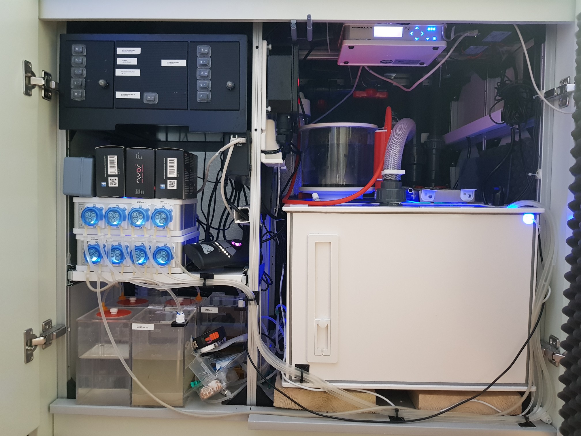 Es ist ein Red Sea Max S-400 LED mit Royal Exclusiv Dreambox und GHL Aquariumcomputer Profilux 4.