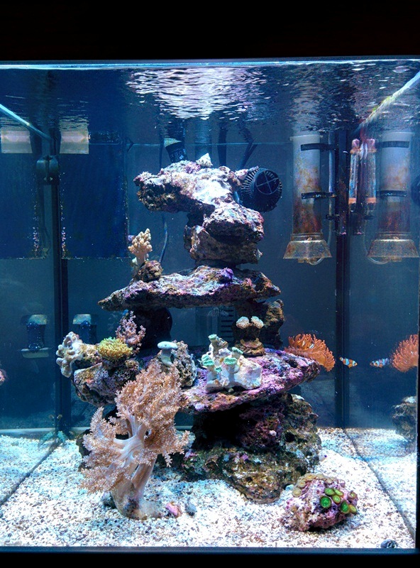 Der Start des Beckens erfolgte am 06.12.2014. Die klassische Einlaufphase verlief wie im Bilderbuch: Wasser angesetzt - Riffsäule aus Lebendgestein gebastelt - nach 3-4 Wochen wurde es etwas Kieselalgig - weitere 2-3 Wochen kamen die grünen Fandenalgen - Einzug von Einsiedlern, Turboschnecken und die ersten Weichkorallen - Alles super! Allerdings blieben hier schon die oft beschriebenen Ammonium, Nitrit und Nitrat-Peaks völlig aus! Naja, nix bei gedacht, denn die Paar Korallen sahen ja zufrieden aus.