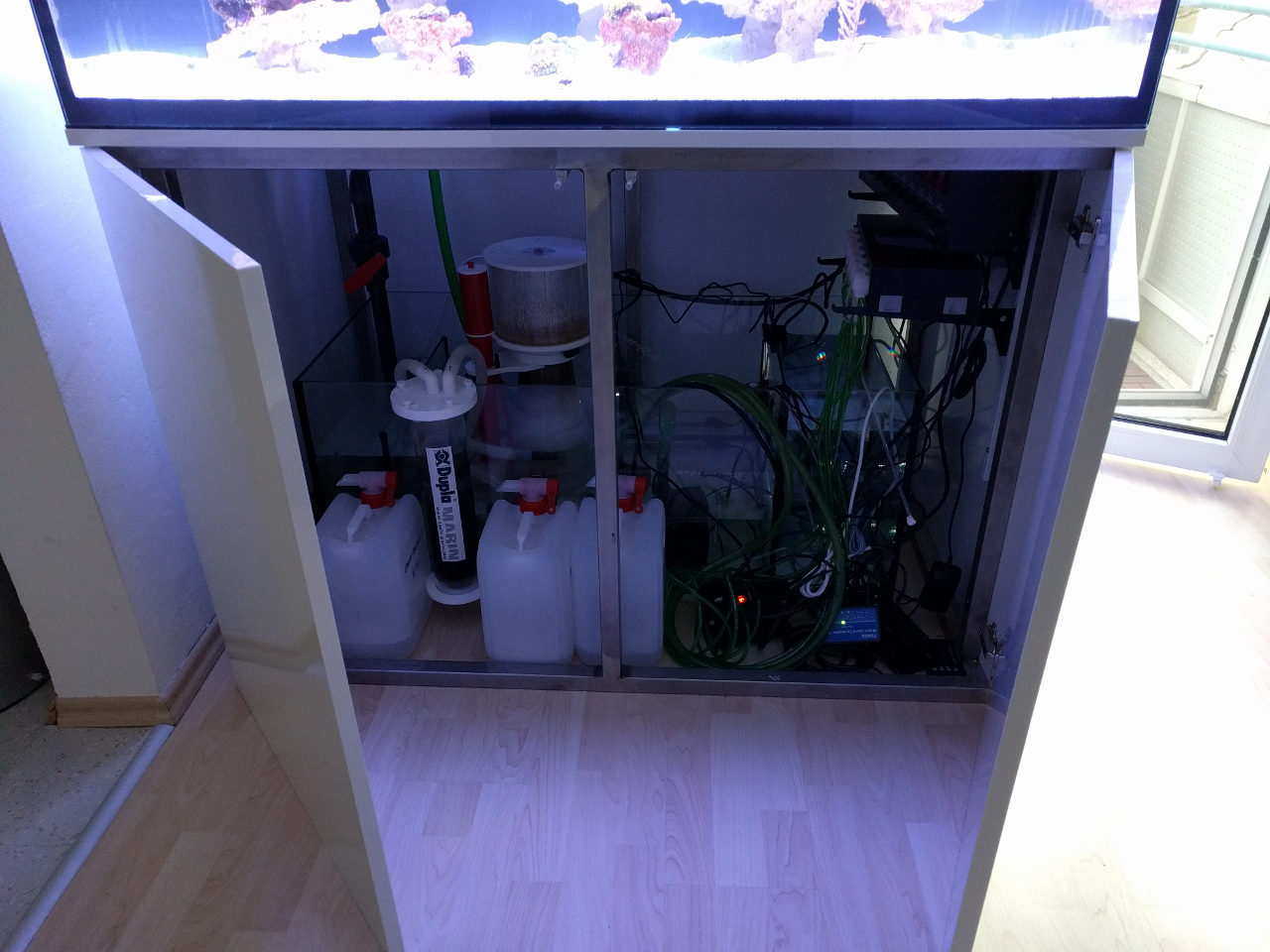 ich hatte bis vor kurzem noch ein EHEIM incpiria marine 300 welches ich hier damals vorgestellt hatte. Vor 2 Wochen wurde dieses mit einem, maßangefertigten, 500 Liter Becken ausgetauscht. Da das neue Becken an der gleichen Stelle wie das Alte stehen sollte, wurde alles an einem Tag umgezogen. Sprich Tiere usw. aus dem alten Becken raus in Eimern, Wasser abpumpen, leeres Becken in anderen Raum verfrachten, neues Becken aufbauen, komplett neue Riffkeramik von RiffSystem rein stellen (ich habe keine Steine vom alten Becken mit genommen), neuen Sand rein (auch hier ist nichts vom alten Becken mit genommen worden), frisch angesetztes Wasser + ein paar Liter vom alten Wasser rein, Technik anwerfen und den Besatz sofort wieder zurück führen. Am Abend um 21 Uhr war ich dann endlich im großen und ganzen fertig. Wie streßig und anstrengend das ist brauch ich glaube ich keinem zu erzählen