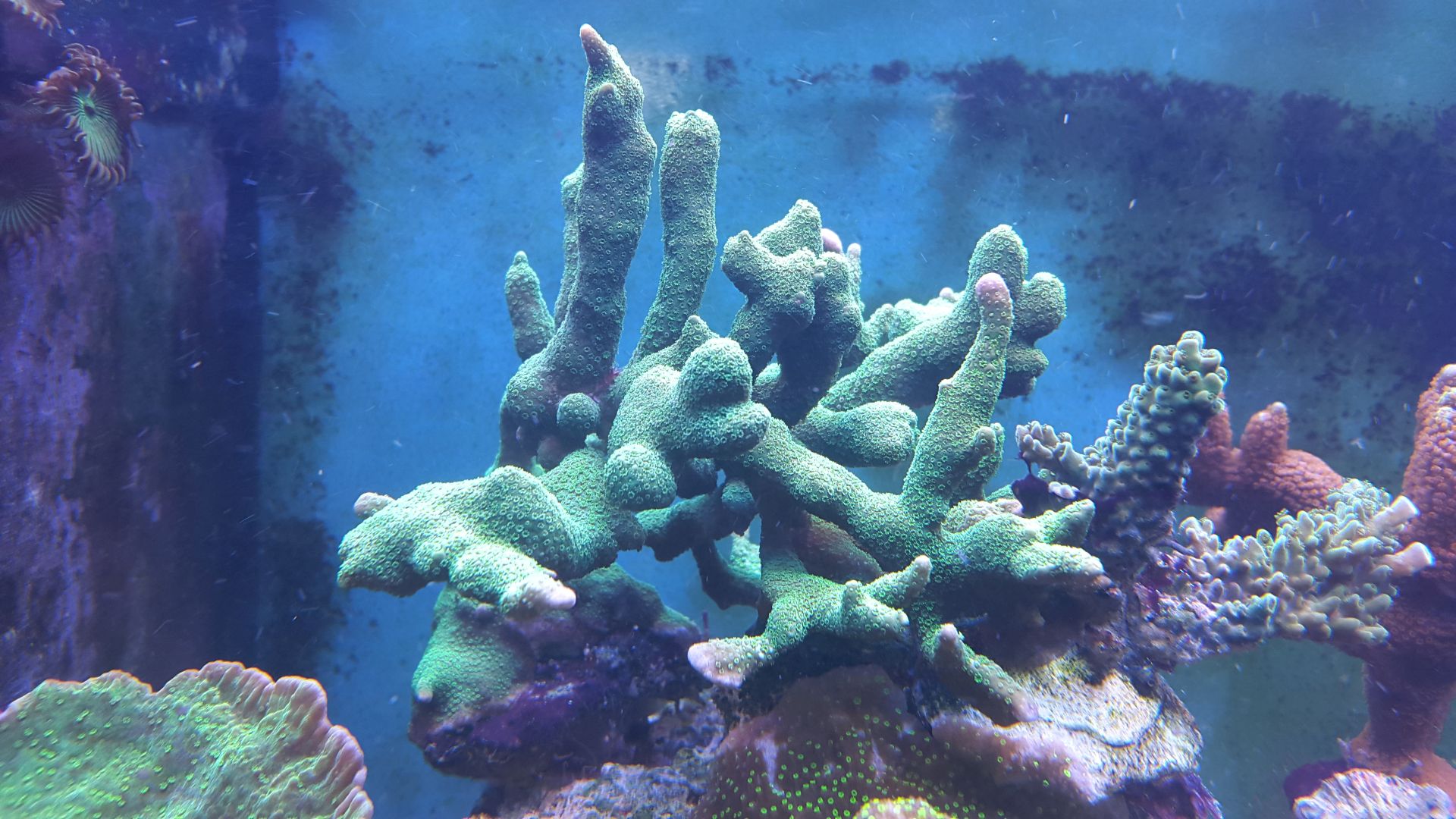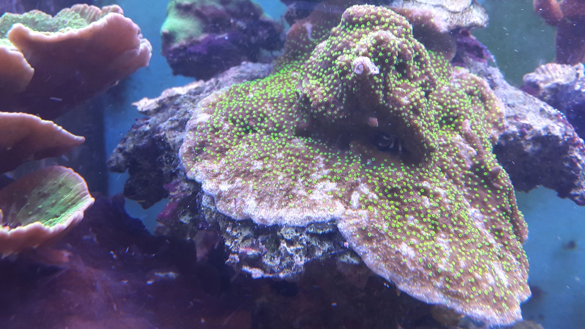 Man sieht an der grünen digitata, das ihre Polypen nicht draussen sind. Waren sie bis zum Umzug immer. Und die Hoffmeisteri sieht auch nicht gut aus. Ihre Polypen sind auch nur minimal zu sehen.