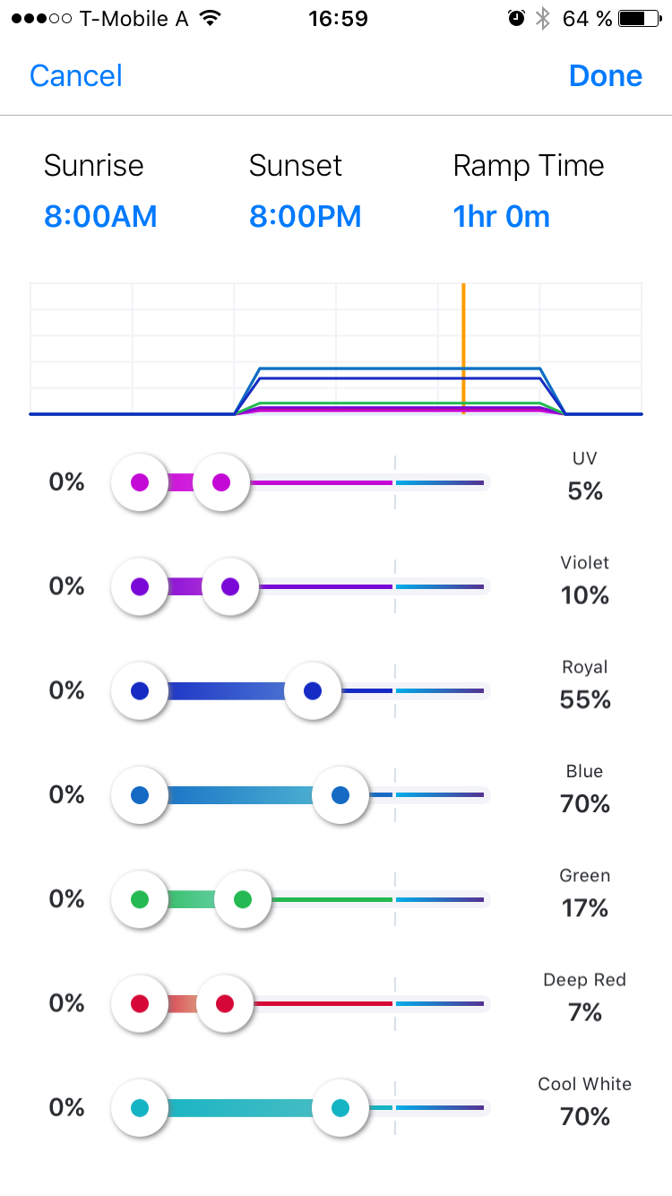 Das Becken sollte möglichst gleichmäßig beleuchtet werden. Bei deinem Profil hast Du nach ein paar Stunden weniger Leistung, dann geht sie wieder nach oben, zieht also bis am Abend wieder an und dann wieder runter. Das ist so kein natürlicher Verlauf.