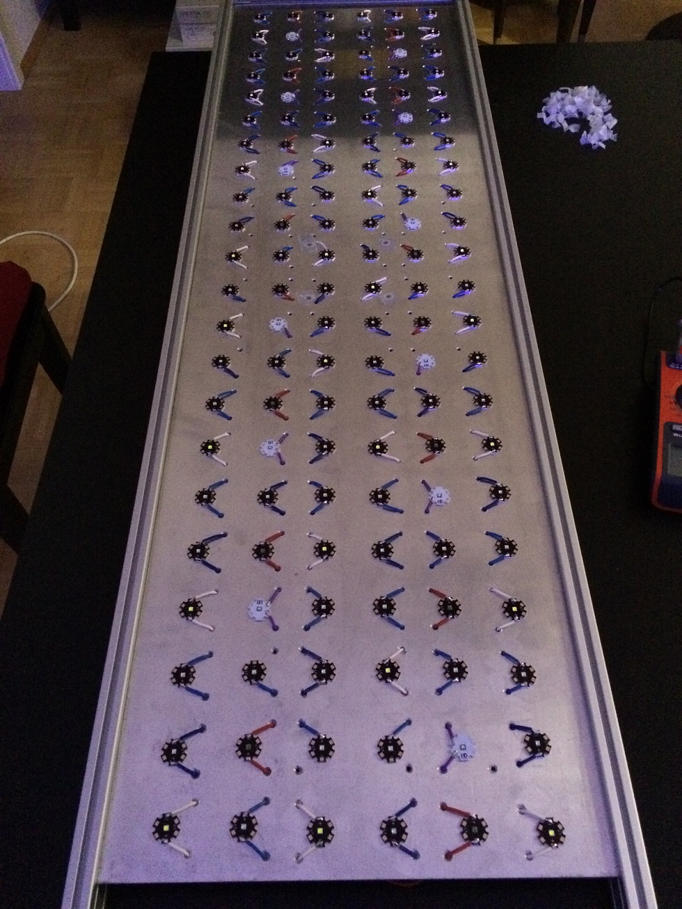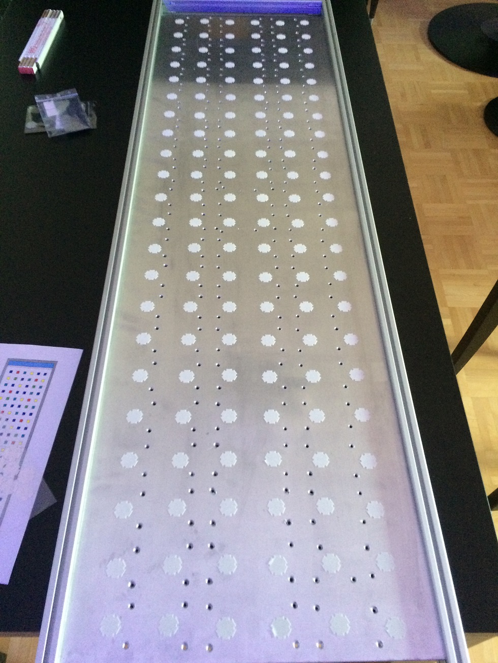 Die Platte ist etwas schmaler als der Rahmen, um an beiden Seiten einen offenen Bereich zu erhalten, durch den die warme Luft nach oben ziehen kann. Schlussendlich hatte die Platte folgende Maße: 1240 x 367 x 4 mm. Diese Fläche sollte gleichmäßig mit LEDs bestückt werden. Unter Beachtung der Anschlussmöglichkeiten am Controller waren 132 LEDs auf der Platte zu montieren. Als Abstand wurden hier 35 mm gewählt.