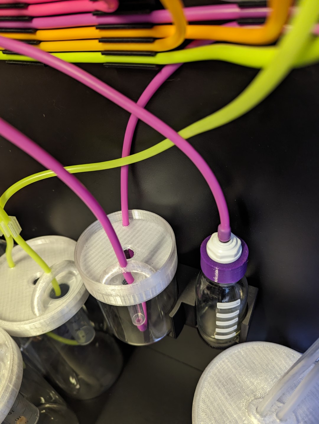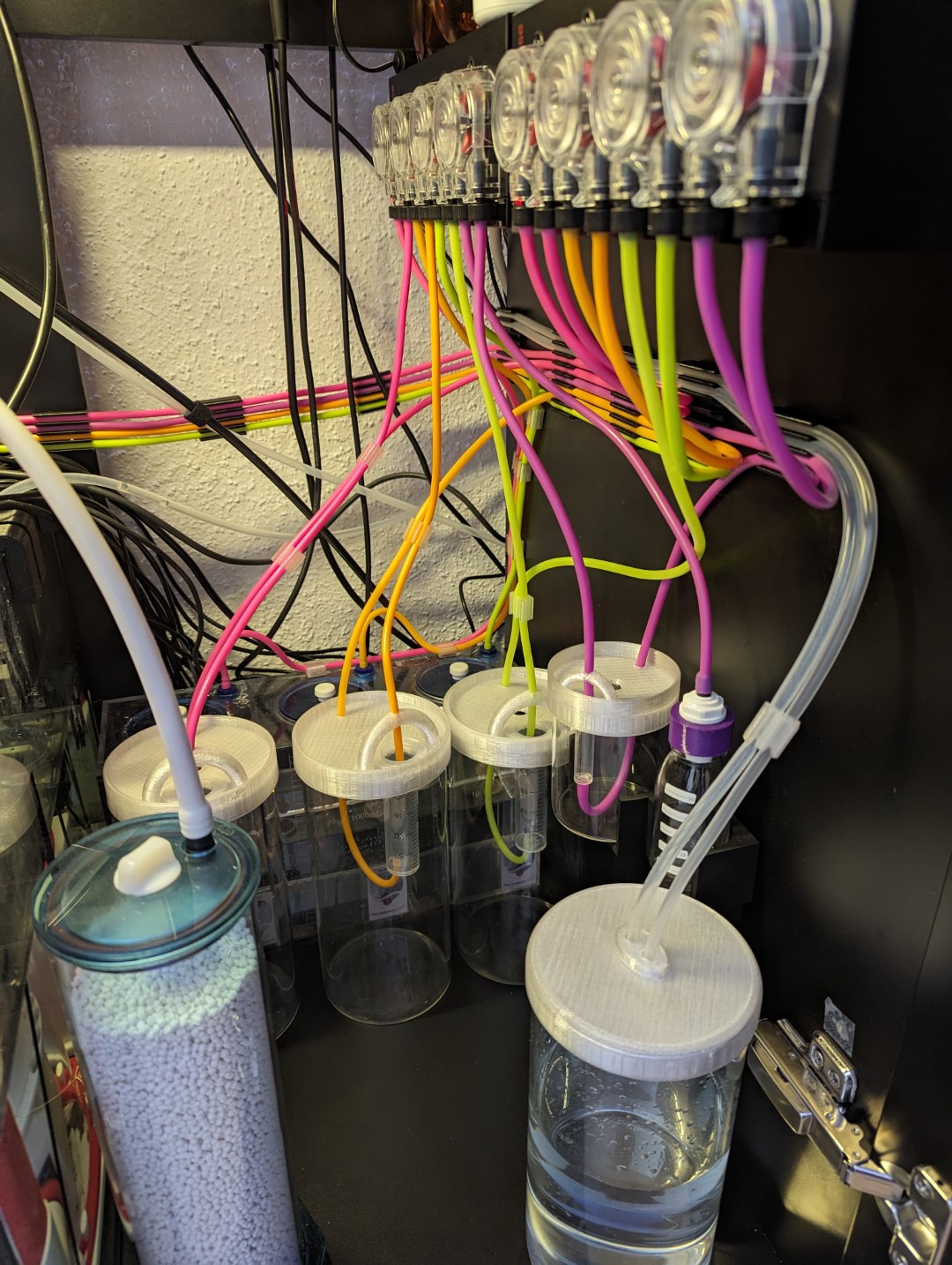 Die Fotos zeigen drei große Behälter für KA, Ca1 und Ca2. Der kleine Behälter ist für den Mix aus Basis 1 und 2.