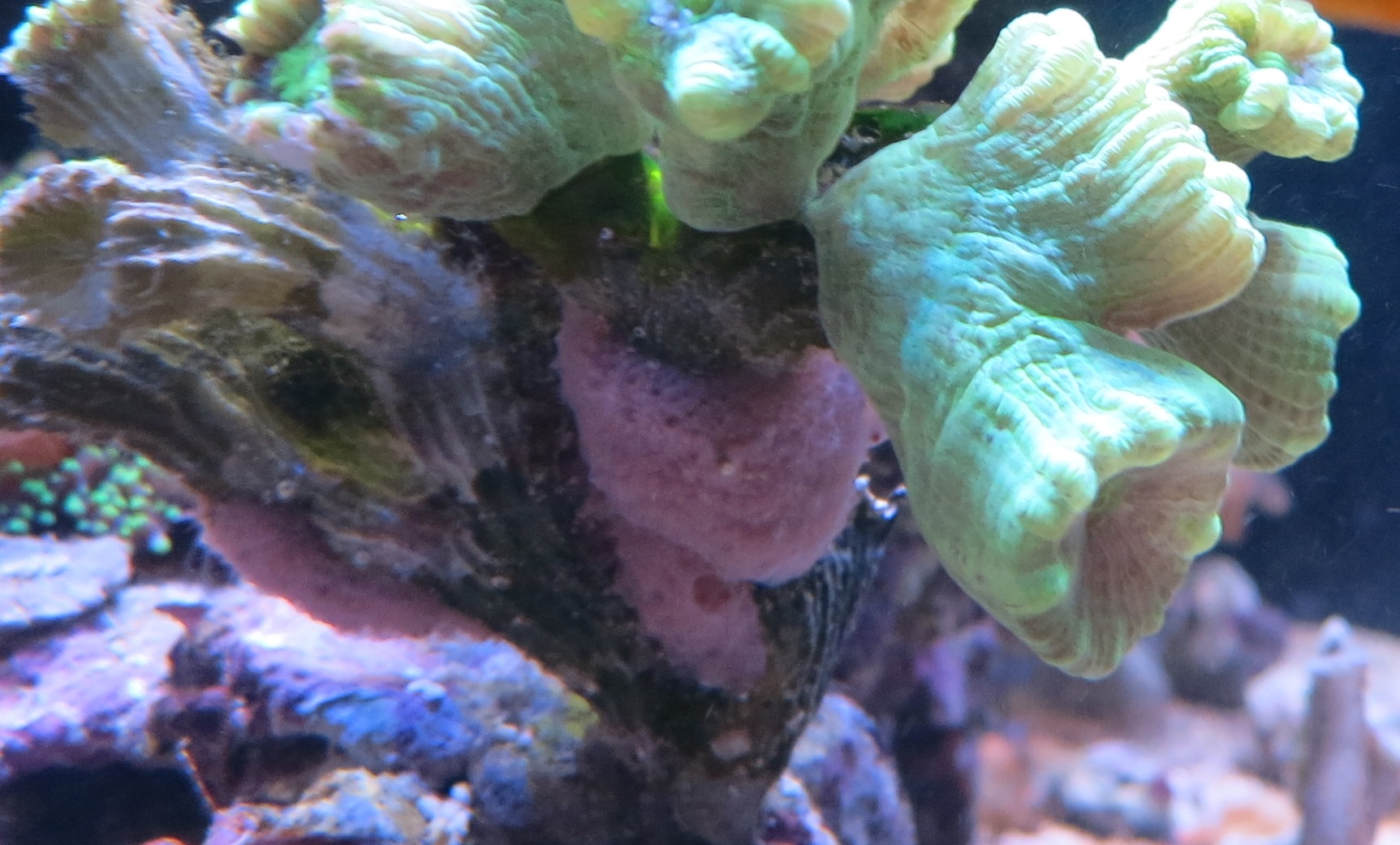 an meiner Caulastraea ist seit einiger Zeit so ein rosaner Belag, was kann das sein? Muss ich dagegen etwas tun oder ist das harmlos?