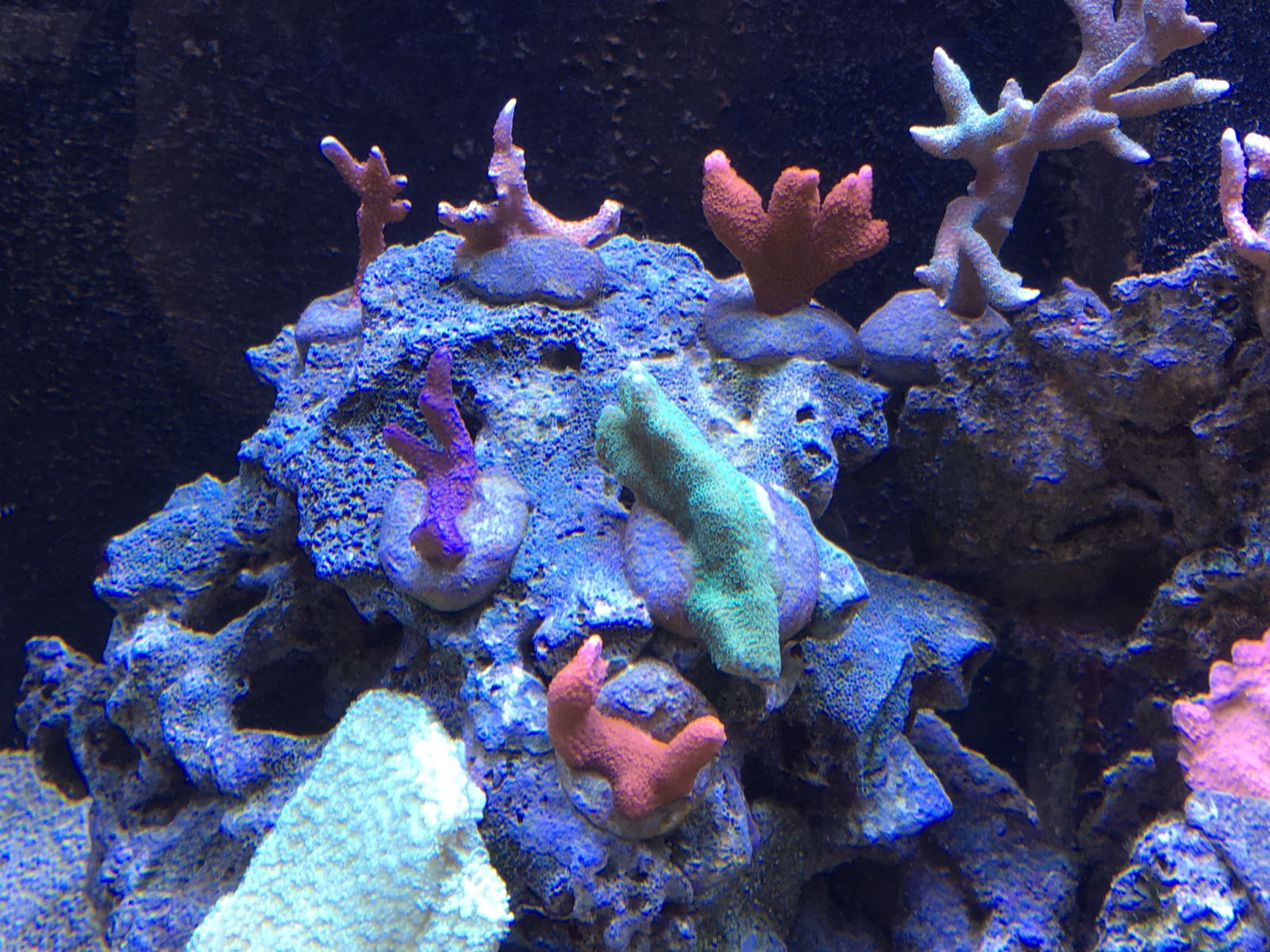 Die linke Seite der Milka (ganz rechts oben) ist mit Algen zugesetzt. Bei den anderen SPS oben auf dem Gestein sieht es so aus als würde die linke Seite auch schlechter aussehen als der Rest.