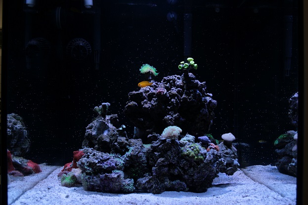 Der Riffaufbau ist zu 90 Prozent so geblieben, da im größeren Becken nicht so globig wirkt, wie in 36 Litern. Zur Rückwand habe ich zwischen 1-3 cm Platz gelassen, sodass die Strömung auch schön hinterm Riff zirkulieren kann. Die Koralia habe ich ca. in 2/3 Höhe vom Boden platziert und ganz leicht nach innen. Sand habe ich nach Empfehlungen der SEA-Z genommen, genauso wie die Einstellung der ATI.