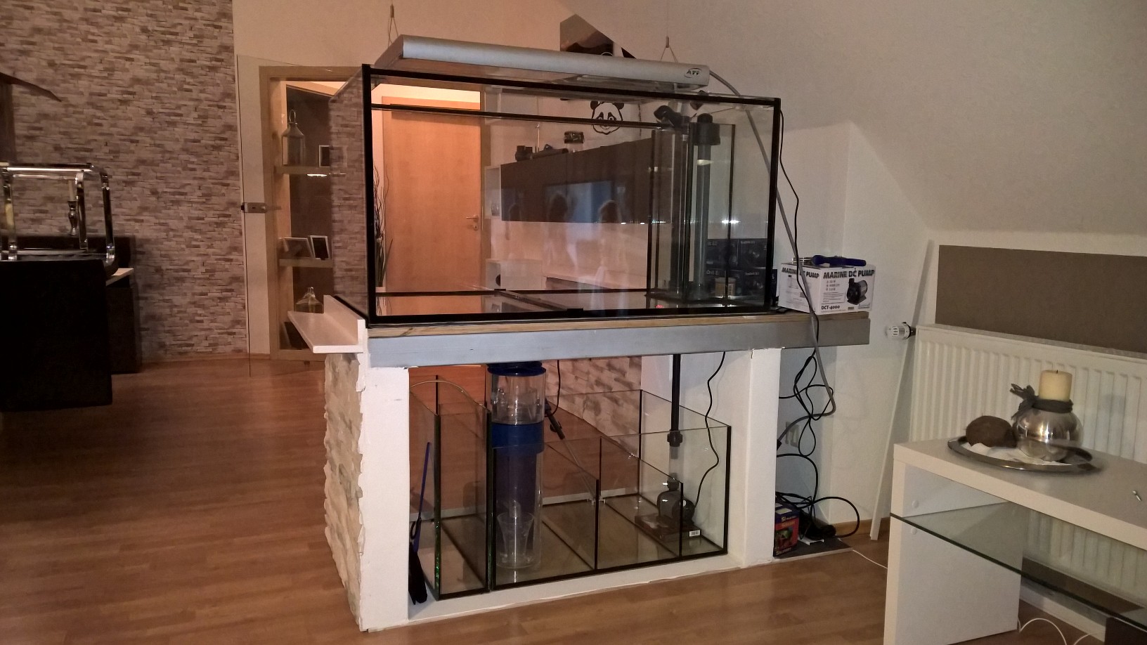 Den Unterschrank des Beckens habe ich selbst gebaut, dazu mal ein Foto, auf dem man den generellen Aufbau recht gut erkennen kann. Die Verkleidungen sind auf den Längsseiten jeweils nur mit Magneten an den Stahlträgern befestigt und lassn sich abnehmen, sodass das TB recht gut zugänglich ist. Ein kleines Elektroabteil habe ich separat abgetrennt und sitzt hinter der letzten Yttongwand.