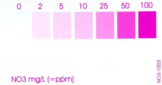 neben Nitrit beeinflusst auch Chlorid und Eisen die Nitrat Analytik. Bei den meisten Nitrattest ist die Skalenauflösung der Ergebnisswerte auch sehr weit auseinander. Bild ist vom Salifert Nitrat Test.