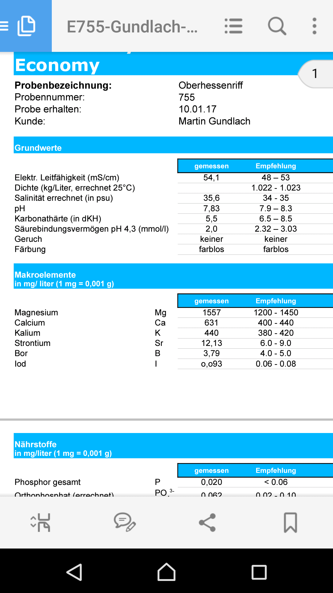 Ich messe immer vor meiner Analyse, Teste zuerst mit Referenz und dann das Beckenwasser. Bei meiner letzten Analyse waren CA und KH aus dem Ruder und deckten sich nicht mit meinem Ergebnissen. Ich will damit sagen das auch bei einer Analyse Fehler passieren können, darum würde ich Claude dazu nochmal kontaktieren, ev. misst er dir die Probe nochmals durch.