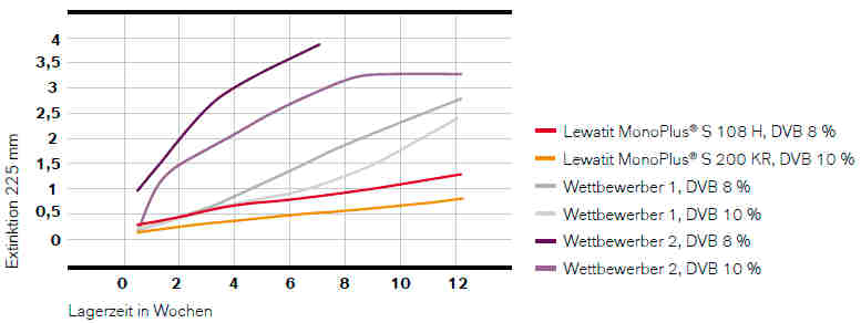 Das angehängte Bild zeit die niedrige TOC-Abgabe (Leaching) des Kationenaustauschers in Abhängigkeit von der Lagerzeit in Wochen ( Quelle LANXESS Deutschland GmbH).