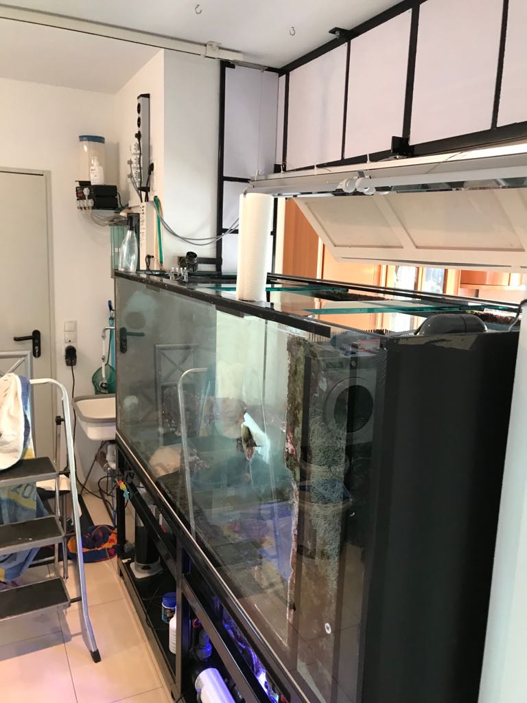 Dann das Becken halbwegs leer laufen lassen und sauber gewischt. Während der ganzen Zeit die Kalkrotalgen und an die Rückscheibe gewachsene Montiplatten mit Meerwasser besprüht, damit sie nicht komplett absterben. Hat mehr oder weniger funktioniert.