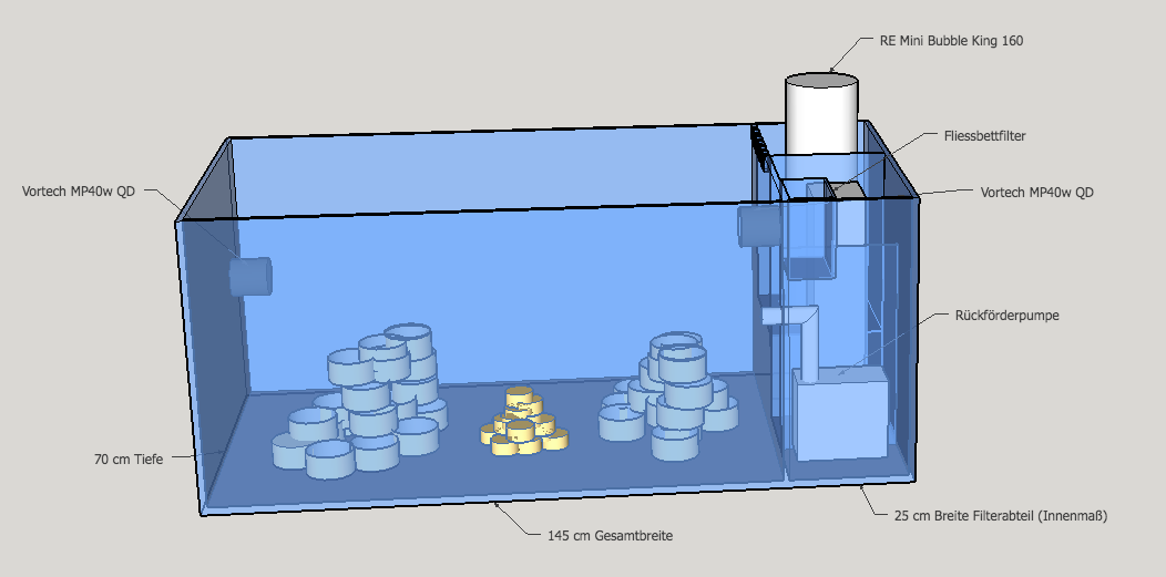 Wenn ich auf die MP40w QD setzen würde, wie in der Zeichnung eingeplant, dann käme vermutlich nur die eingezeichnete Platzierung in Frage. Denn sonst müsste ich auf der Filterabteilseite zwei Trockenkammern einrichten, was mit dem recht lange Überlaufkamm vermutlich eher schwierig wird.