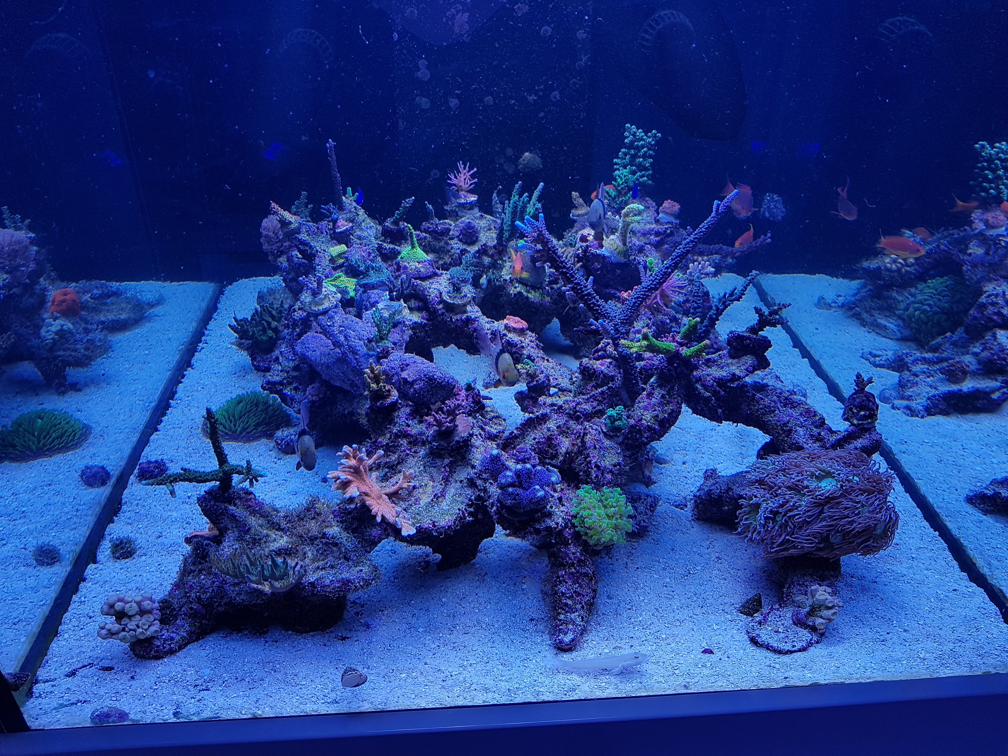 Bin aktuell relativ zufrieden. Alle korallen wachsen und gedeihen. Leider immer noch ein paar Glasrosen, Kugelalgen und Cyanos. Aber im ganzen gehts dem Becken gut und das ist die Hauptsache.