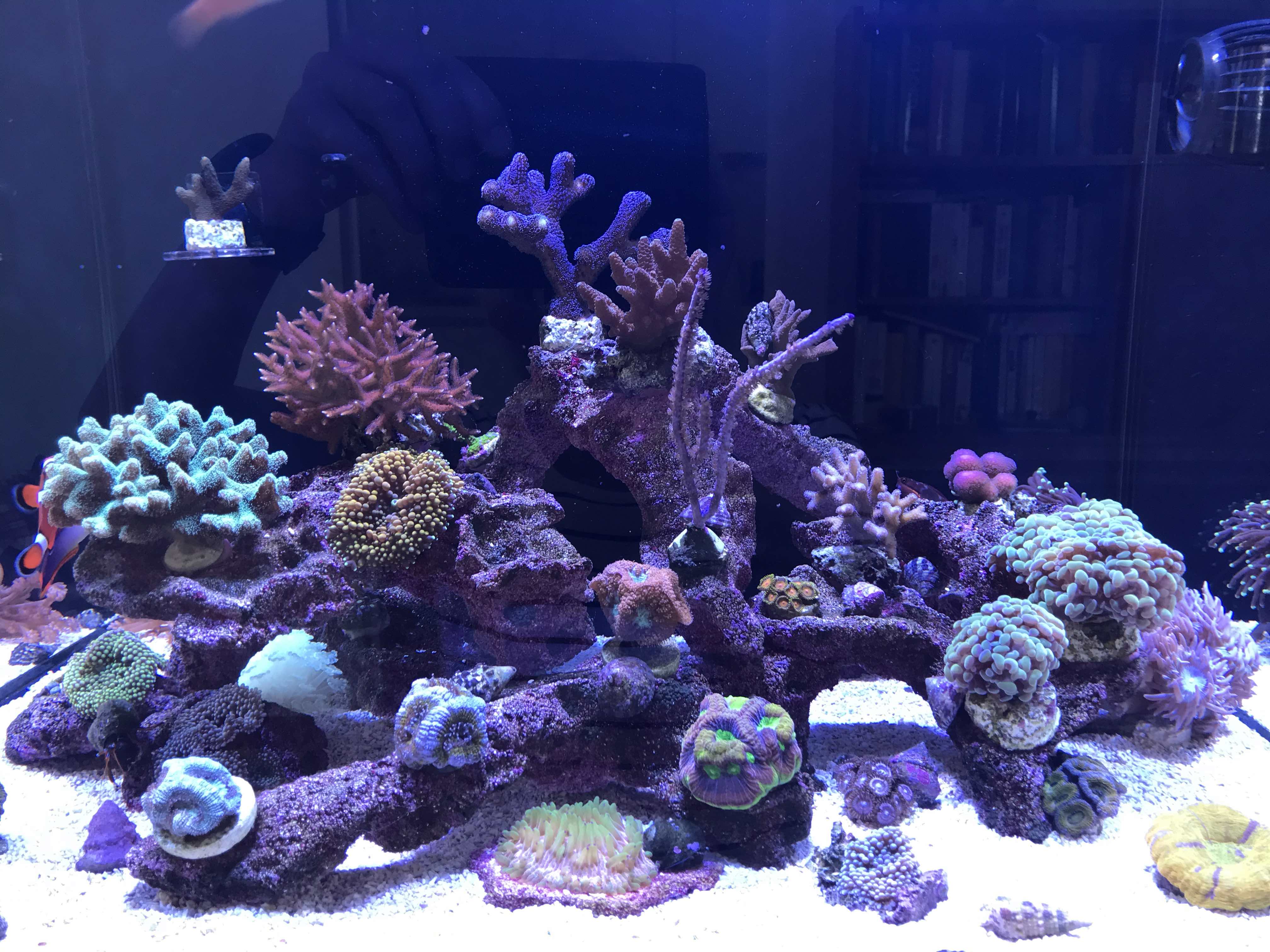 Zum Becken selbst. Momentan läuft es ganz gut. Korallen wachsen. Wie man auf dem Foto sieht habe ich Korallen abgegeben und LPS Korallen umgesetzt und ein paar Neue sind eingezogen.