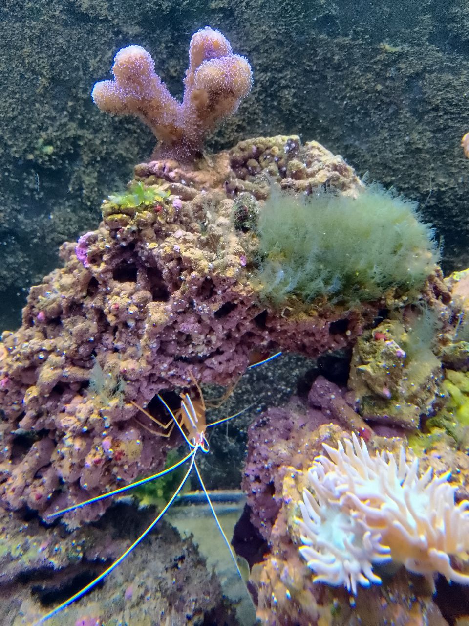 Algen, darunter Kugel und Drahtalgen verbreitet sich im Becken, was einen sehr natürlichen Look erzeugt. Leider auch die Bryopsis Alge und eine die wie ein Salatblatt ausbreitet.