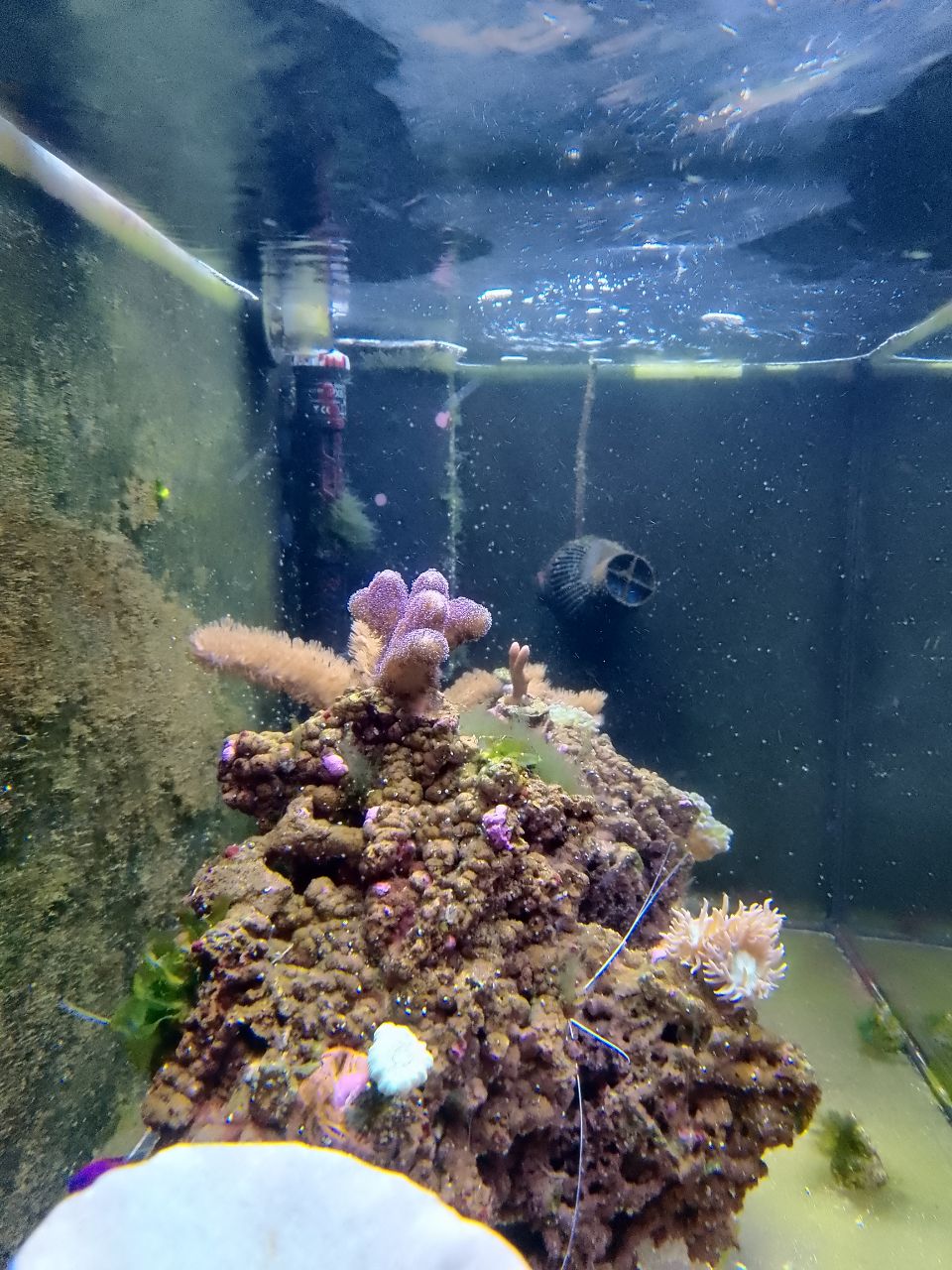 Die Korallen wachsen, nicht so extrem schnell wie es in anderen Becken möglich ist aber Sie wachsen. Auch hat sich ein sehr kleiner KH Verbrauch eingestellt. Minimal aber da, mühsam ernährt sich halt das Eichhörnchen. Kleinstschnecken die ich nie eingesetzt habe vermehren sich. Eine Art Gehäuse-Schnecke, 2 Stück, die aussehen als hätte eine graue Nacktschnecke einen Fingernägel auf den Rücken geschnallt leben auch im Becken. Die fressen auch sehr gut die Algen und sind Tag sowie Nachtaktiv, dabei sogar Recht flink.