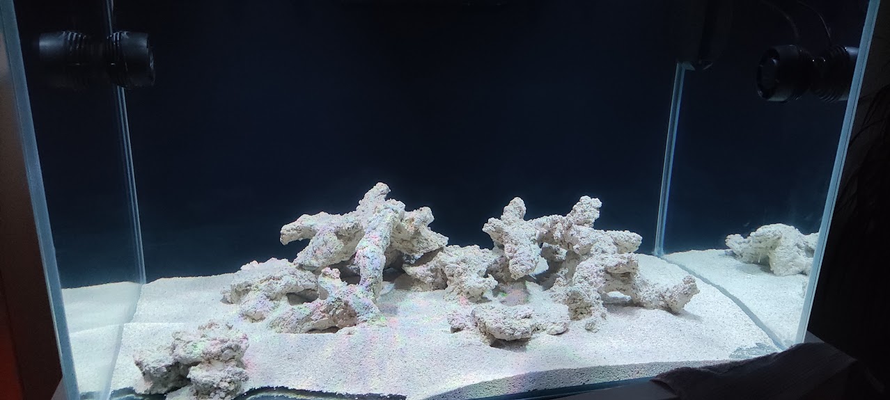 Von der Gestaltung haben wir mit Riffkeramik vom Händler (Marke leider nicht bekannt, da die Steine lose verkauft wurden) und 1 Sack CaribSea life Sand verwendet.