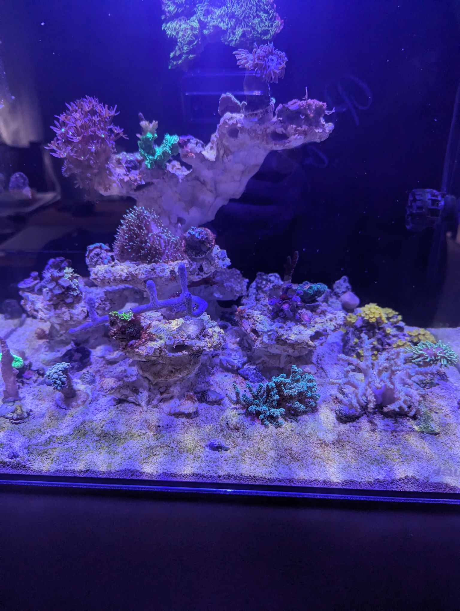 Im Becken ist ein Riffpfeiler aus Keramik und 2 kleine Faustgroße Brocken Lebendgestein. Besatz ist gemischt, Cleaning Crew und ein Pfaffenhut sind im Becken.