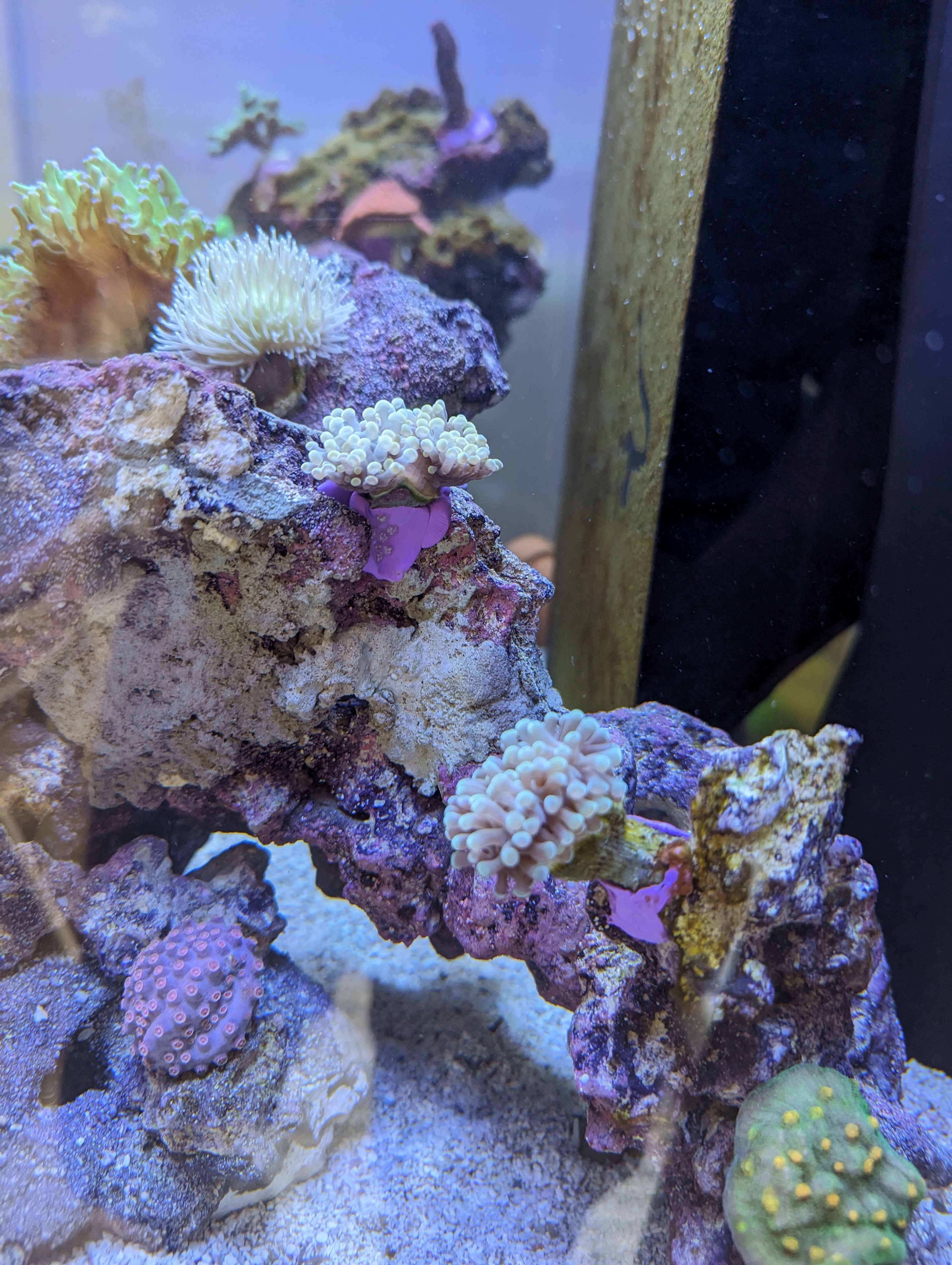 Wachstum habe ich bisher wenig. Die Bartkoralle hat einen neuen Kopf und eine Euphy hat einen neuen kopf, Kalkrotalgen sehe ich auch einige, aber bei milka und stylophora konnte ich kein substantielles Wachstum feststellen. Das Licht habe ich über die letzten Wochen langsam auf inzwischen 55% hoch gezogen. UV auf 45. Sollte ich hier noch höher gehen?