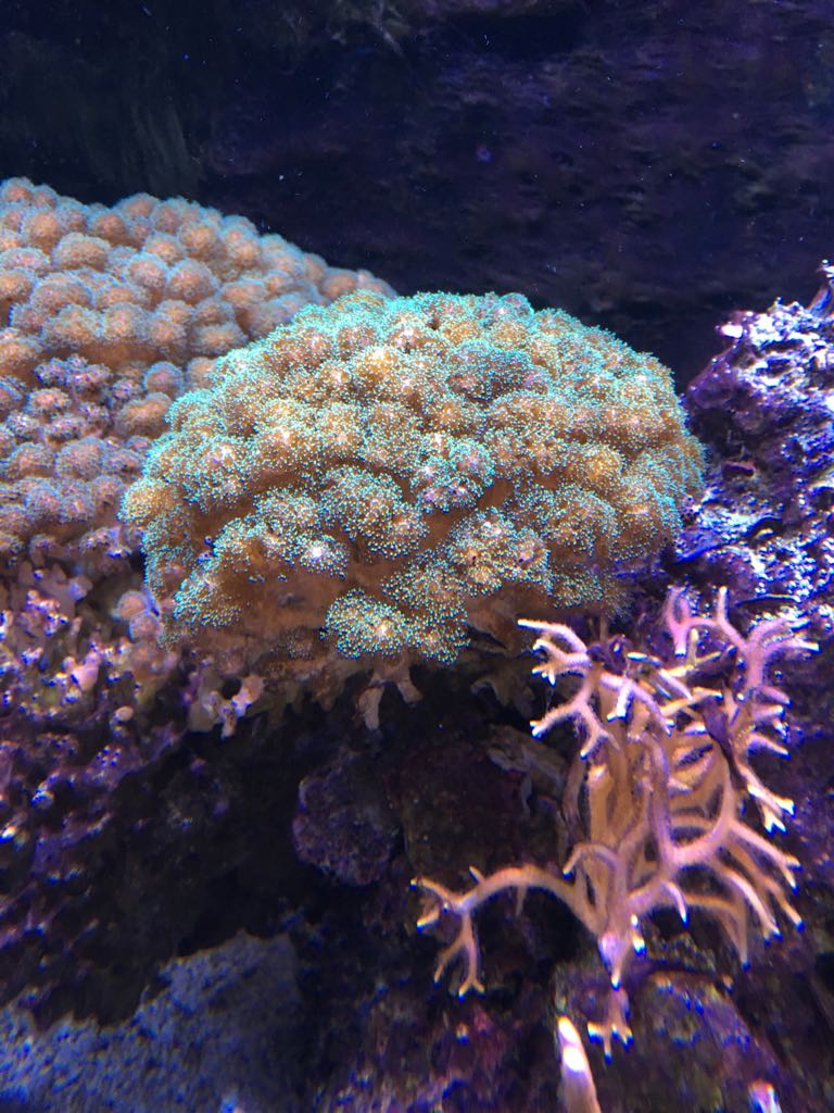 Korallen stehen soweit ganz gut, naja die Farben sind nicht so doll, aber die Polypen sind gut da.