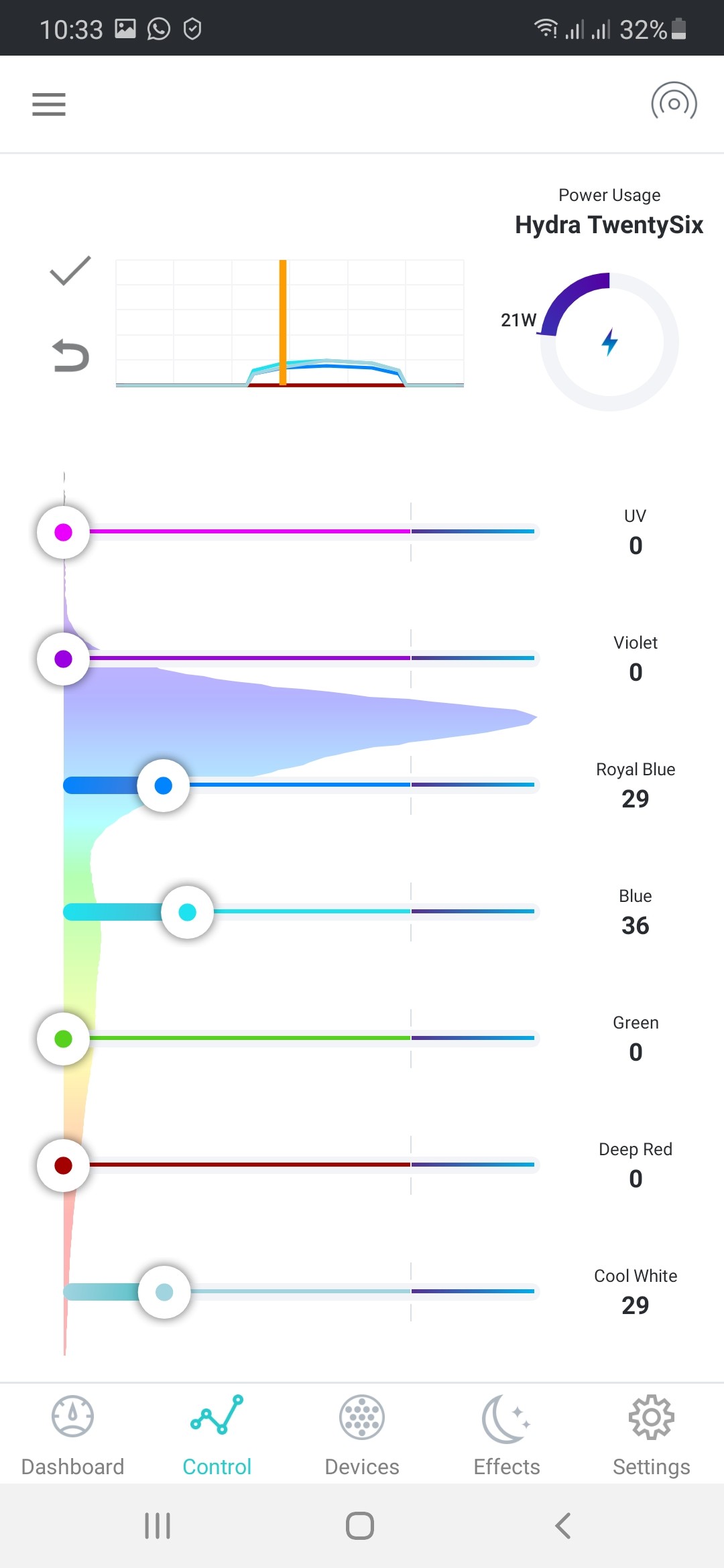 Lampeneinstellung: über dem Becken sind eine Hydra 26 und eine Prime 16 HD, am Anfang waren sie so eingestellt, dass beide zum Tageshöchstpunkt etwa 30 Watt Leistung gebracht haben. Seit etwa 1 Woche, seit die Cyanos komplett aus dem Ruder laufen, habe ich die Gesamtintensität etwas runtergefahren, auf max. 24 Watt (auch weil die SPS an lichtexponierten Stellen zwar Polypen zeigen, diese aber hell werden). Außerdem habe ich rot, grün und violett komplett rausgenommen und den weißen Kanal auf 80% runtergestellt (ist jetzt also gleich hoch eingestellt wie royalblau).
