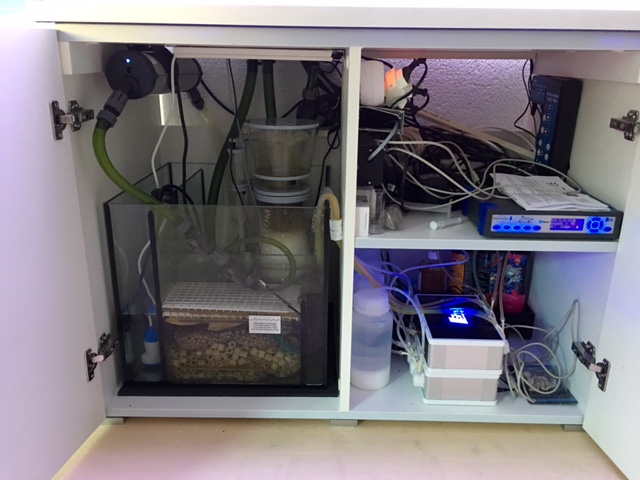 Angefangen hat meine Meerwasserkarriere vor gut 1 Jahr. Wir haben uns im Büro ein Nanocube 60l installiert. Der lief ca 8 Monate völlig problemlos und die Korallen wuchsen sehr gut. Dann wechselte ich die Stelle. Der 60l Cube war mir zu aufwändig im Alltag, sodass zu Hause das 300l Becken eingefahren wurde und der Cube dann entsprechend umgezogen ist.