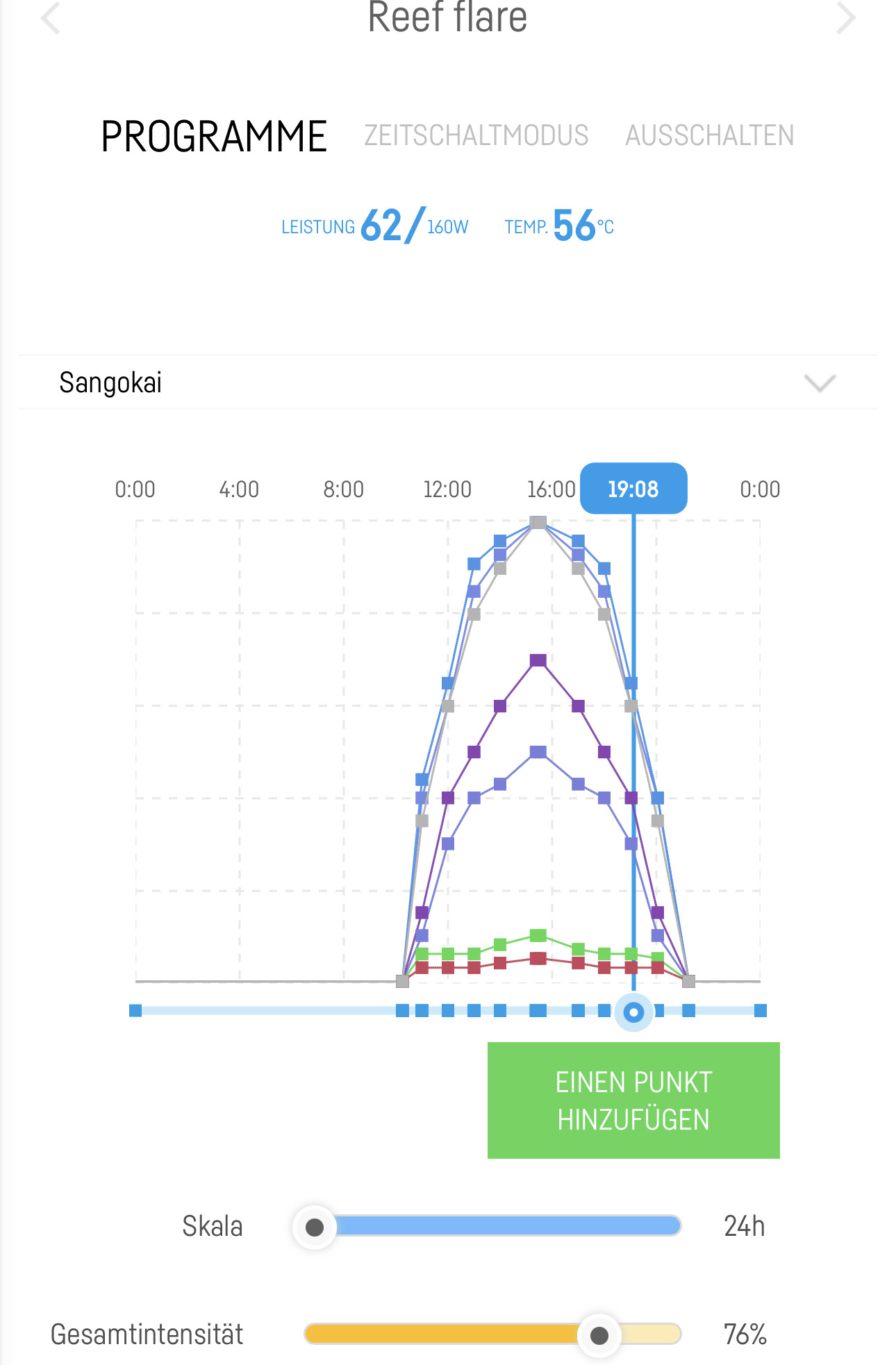 Da ich selbst auf diese Lampe ( reef Flare Pro M) gewechselt bin habe ich versucht den sonnen verlauf so gut wie möglich hin zu bekommen. bin ich noch dabei eine Ideale mischung zu finden mich stört nur das im SPS/LPS programm UV und Violett so hoch gesetzt wird, dazu Grün und Rot auch nicht gerade ...