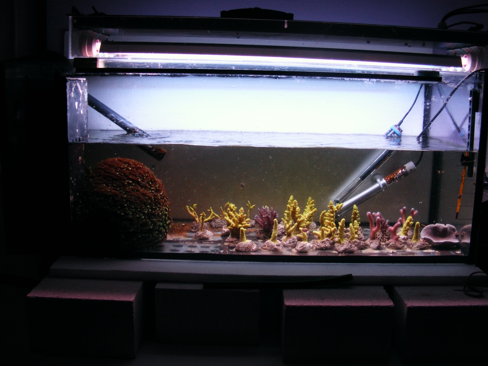 Hallo Günther, vielen Dank für die Tips. In dem Algenrefugium hatte ich gerade gut 2 Liter Algen geerntet, deshalb sieht es so kahl aus. Außerdem wollte ich andere Algen einsetzen und hab mir jetzt Drahtalgen geholt. Warum sollte sich das Lebendgestein im TB negativ auf die Wasserwerte auswirken? Wa...