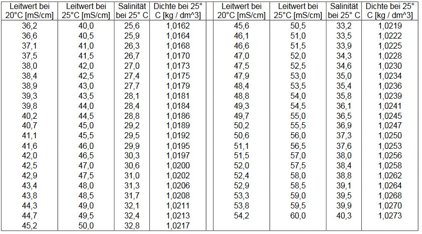 Hi Martin, warum ist die Dichte viel zu hoch? Die Dichte wurde hier angegeben auf 20°C Temperatur. Dein Wert musst Du dann schon auf deine Beckentemperatur umrechnen. Hier gibt es eine Tabelle. Der Salinitätwert 35,3 passt doch fast. Den kannst Du auf 35psu reduzieren, da in den Analysen die Idealwerte meistens auf 35psu angegeben sind.Sonic hat geschrieben: Was mich echt überrascht hat... die Dichte is viel zu hoch ! Habe mir extra im neuen Jahr ne neue Spindel von TM gekauf, morgen Messe ich alles mal gegen.