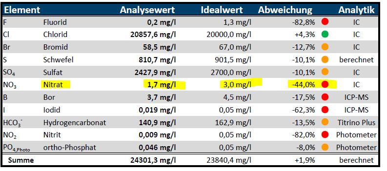 Wo ich mir nicht sicher bin sind manche Werte wie Strontium / Bor / Bromid / Flourid / Eisen ( Fe Gesamt ), also all das was erstmal stark daneben ist.