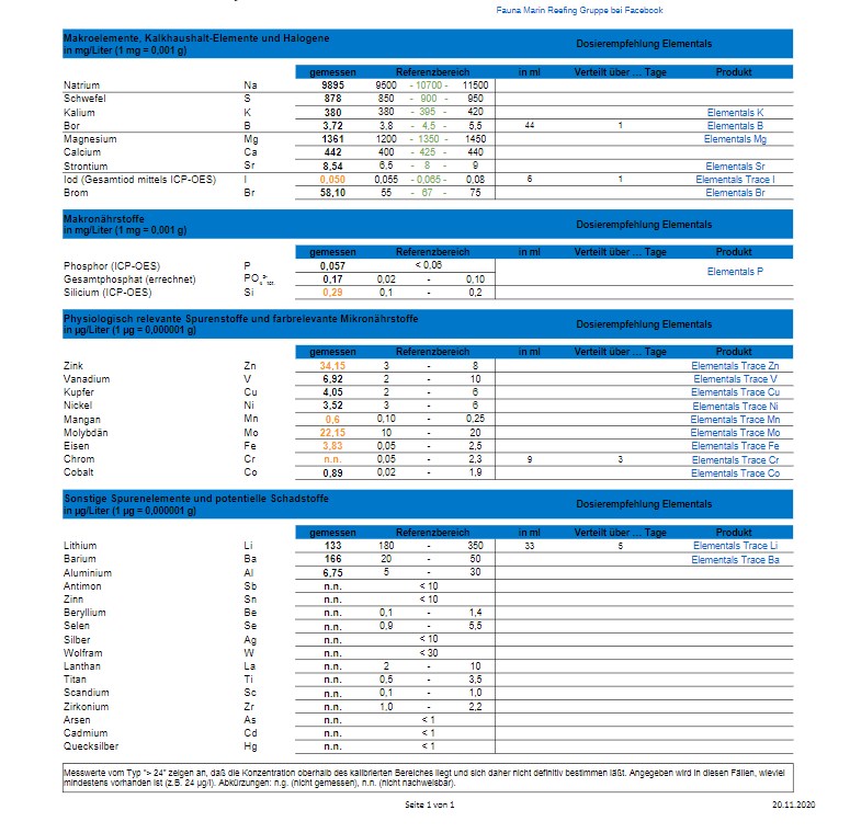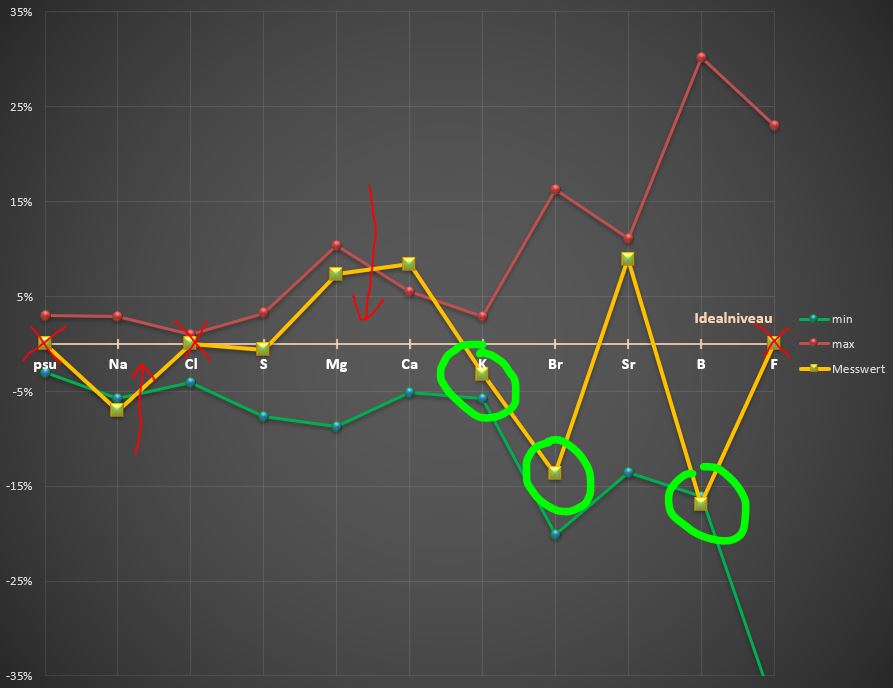die 10223 g/cm3 sind 33,6 psu. Ich würde mir erst Gedanken um die Hauptelemente machen. Die sind nicht im Referenzbereich bezogen zu deiner Salinität. siehe Bild. Im Bild grün eingekreist die Elemente (vornehmlich Brom und Bor), welche du ausgleichen solltest. Die sind bezogen auf die 33,6psu zu niedrig.MartinZ1679 hat geschrieben:Messe mit TM Spindel, Salzgehalt passe ich am Sonntag an,... War zuletzt etwas zu niedrig, 1.0223 beim letzten Mal.