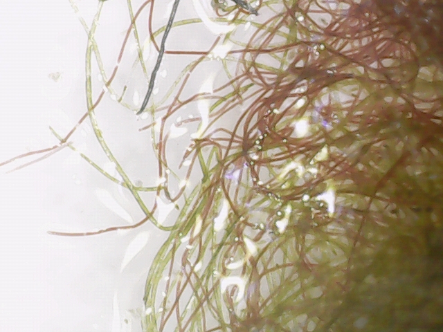 Ich habe grüne Fadenalgen die mit roten Algen überzogen sind.