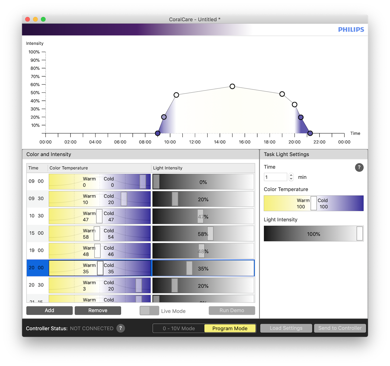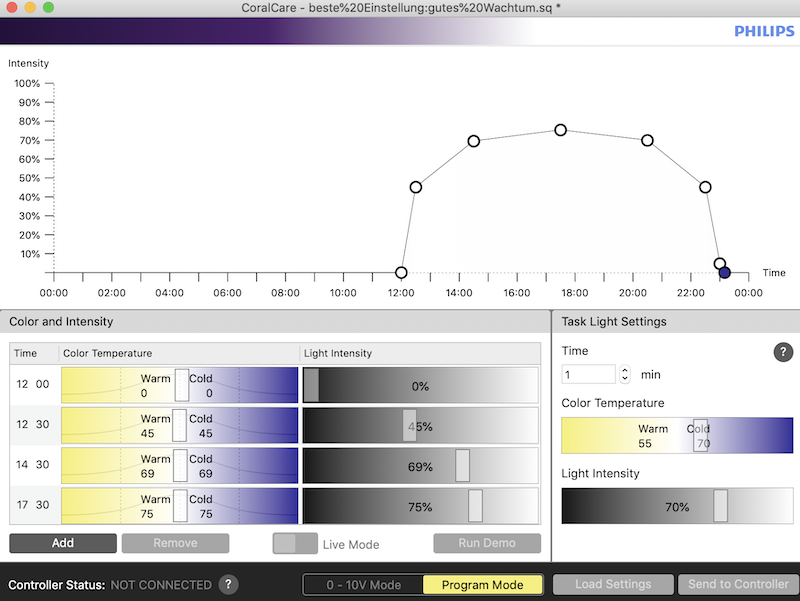 Ich konnte auch beobachten, dass z.B. meine Euphyllia jeden Abend bei Beginn der Dämmerung Zooxanthellen abgestoßen hat und könnte mir vorstellen, dass das evtl. die Ursache für den Dino-Ausbruch sein könnte. Als Beleuchtung hängt bei mir eine Philips Coral Care drüber, die ich im Moment nur mit max. 60 % Leistung betreibe. Mir fällt es aber schwer, eine sinnvolle Lichtfarbe einzustellen, da es zu dieser Lampe nur wenig Vergleichsberichte gibt. Ich habe das aktuelle Beleuchtungsprofil mal angehängt. Würdet ihr daran etwas ändern, um evtl. Strahlungsstress zu reduzieren und den weiteren Ausstoß von Zooxanthellen zu verhindern?