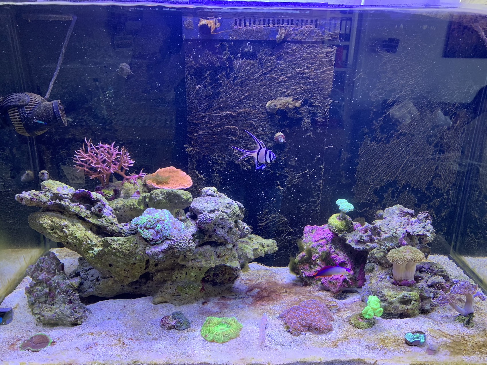 vielen Dank für deine Antwort! Den Bogen und ein Foto habe ich angehängt. Das Foto ist von heute morgen, die Beläge werden üblicherweise im Laufe des Tages schlimmer, dann sind es fast überall auf dem Bodengrund so aus wie unten rechts. Die kleine Euphyllia hinten rechts hat in den letzten Tagen ordentlich Gewebe verloren, die restlichen Korallen haben noch keine erkennbaren bleibenden Schäden. Nur die Seriatopora wird überall dort weiß, wo Fäden von den Algen hängen bleiben.
