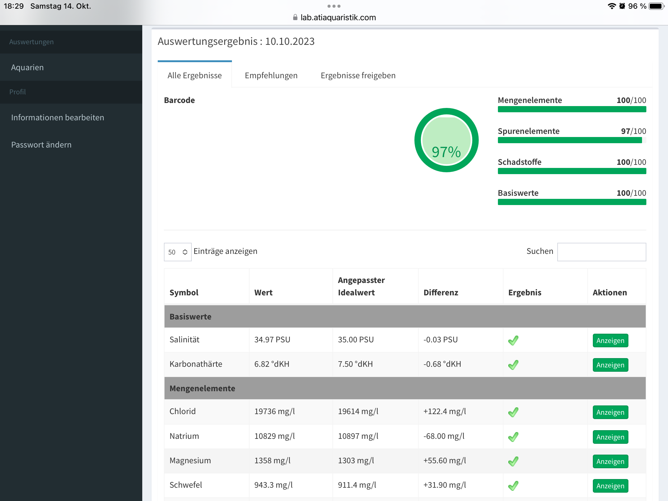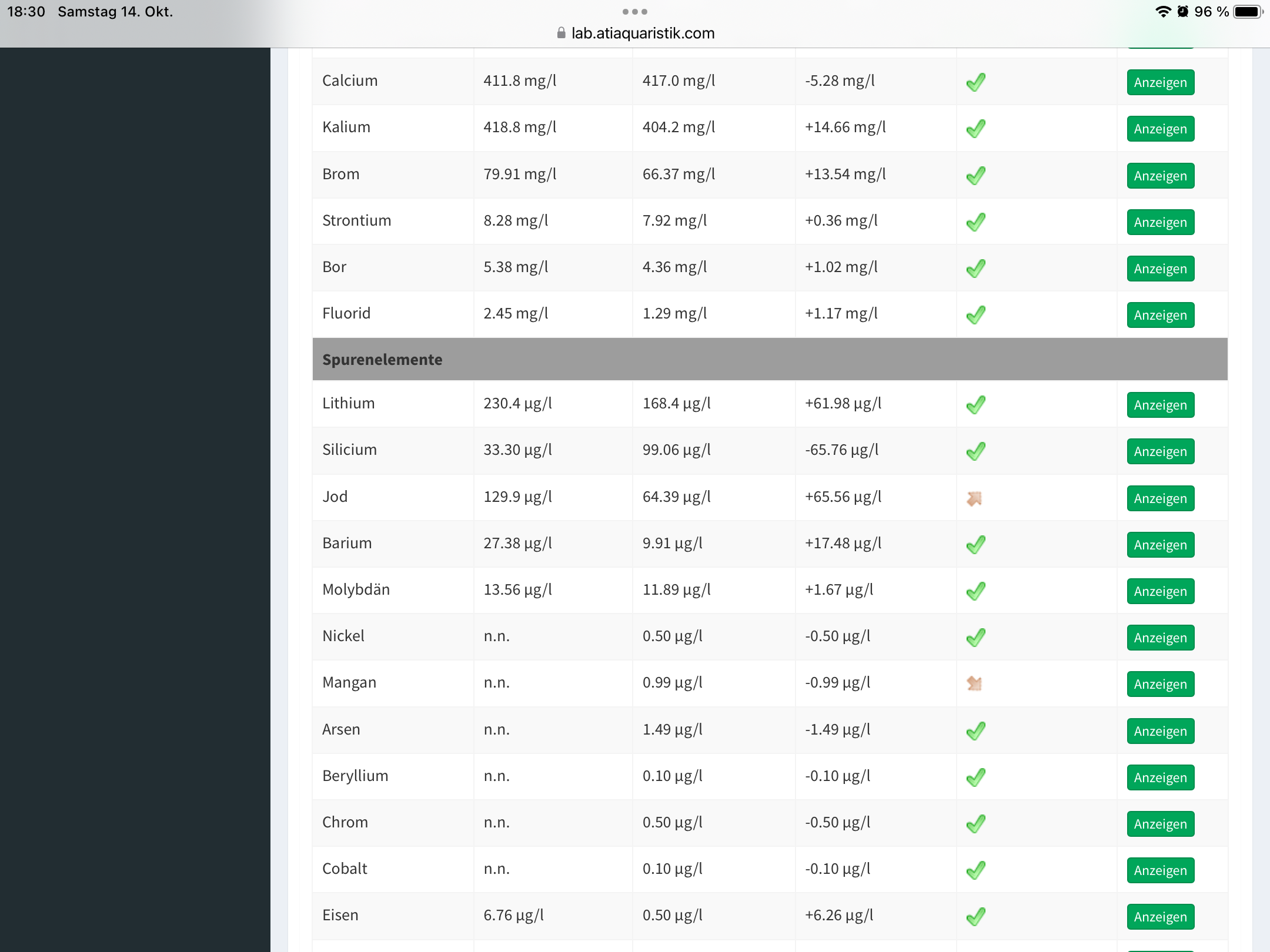 ich bin definitiv kein ICP oder Chemieprofi. Aber was mir jedoch auffällt ist der sehr hohe Jodgehalt, der ist fast doppelt so hoch wie der Idealwert. Bin mir nicht sicher aber meine mal gelesen zu haben, dass ein viel zu hoher Wert wohl Algenfördernd ist. Und dann ist kein Nitrat nachgewiesen. An sich ja nicht schlimm aber da steht nichts von NO2 oder sonstwas an Stickstoff. Also vllt hast du auch ein Nährstoffungleichgewicht im Becken.