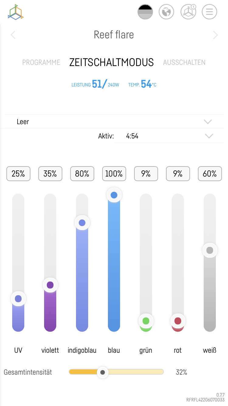 Bleibe auf jeden Fall bitte beim BASIS, das NRG ist zu stark und die Grundlage dafür ist immer, dass die Korallen sehr gut wachsen. Du hast in der Labormessung kein Nitrat nachweisbar, und das wird auch ein ursächlicher Grund sein. Ich würde Dir dringend dazu raten, dass Du mit dem nutri-complete aus dem START System die Stickstoffverfügbarkeit verbesserst. Die Lampe ist vom Spektrum her okay eingestellt, Leistung ist mit ca. 50% ggf. auch okay, aber im Bereich Stickstoff musst Du auf jeden Fall zuarbeiten. Wobei der screenshot zum Spektrum. Was ist denn in der grafischen Darstellung im Profilverlauf die rote Linie? Irgendwie passen die Linien im Profilverlauf ja nicht mit der Spektrum/Kanal-Einstellung zusammen, oder? Vor allem veränderst Du das Spektrum und nimmst ja z.B. Weiß am Nachmittag schnell raus. Ich würde Dir empfehlen, das Spektrum über den Tag mal gar nicht zu verändern, damit sich die Korallen nicht über den Tag umstellen müssen. Eher einen Parabel Verlauf mit gleich bleibendem Spektrum.