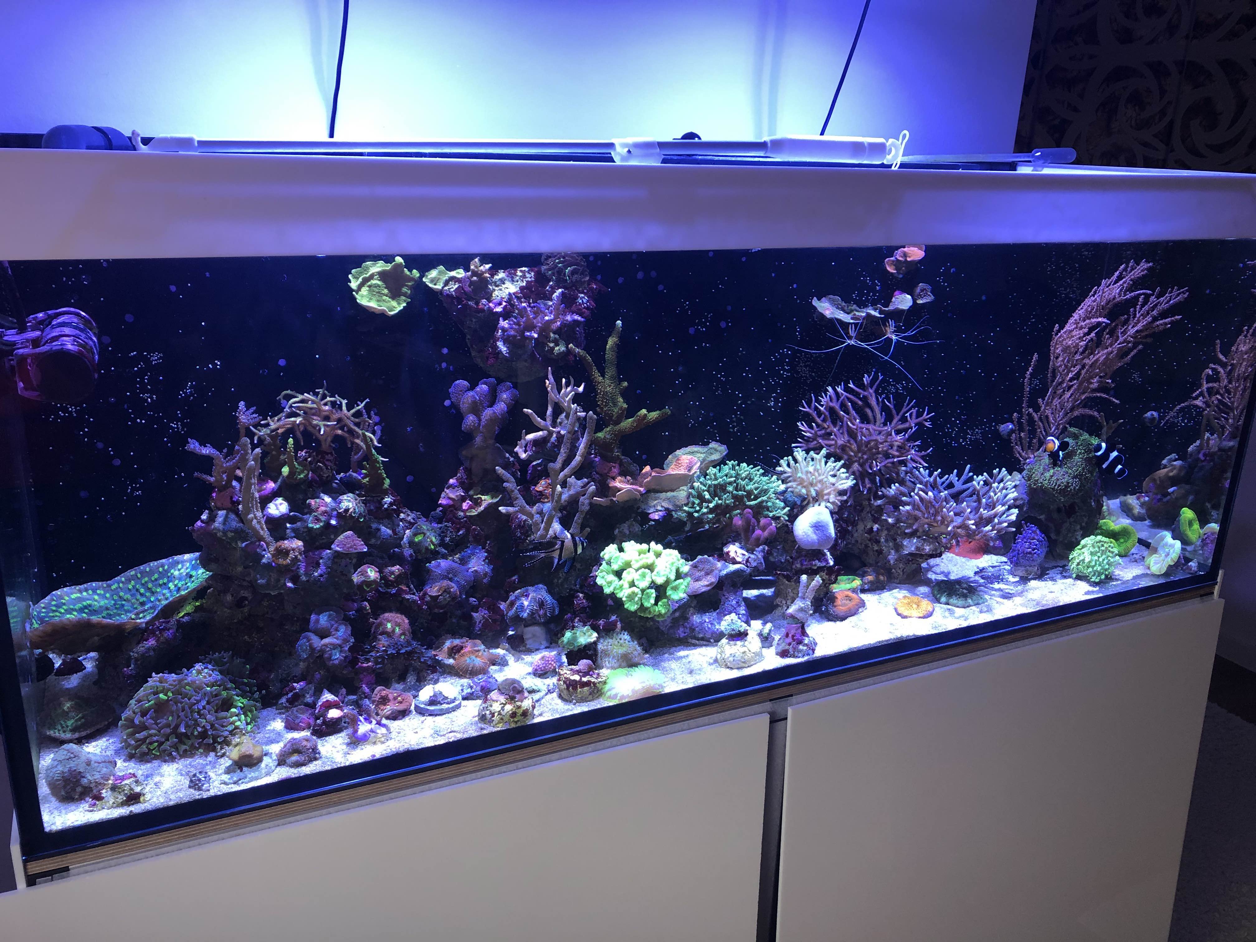 Fische haben wir im Moment nur 2 Kauderni und 2 Nemos. Wir hatten Pünktchen am Anfang und dadurch große Verluste. Es hat lange gedauert, bis wir das im Griff hatten.