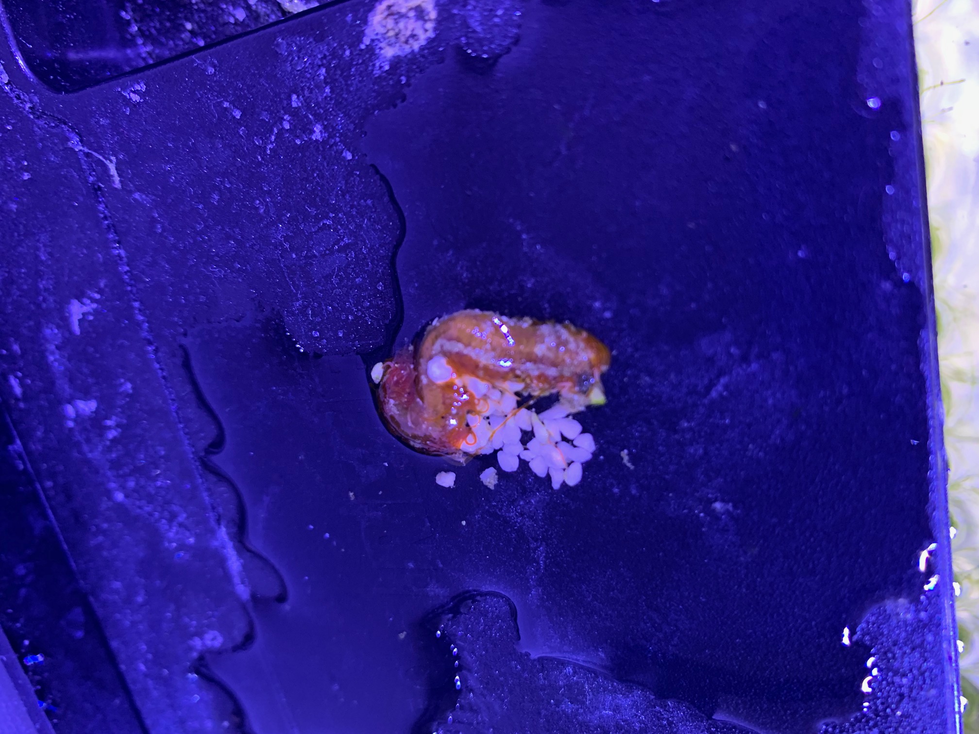 Das Abdere sieht aus wie eine Schnecke ohne Gehäuse und klebte an der Scheibe zwischen den Algen. Ein Strudelwurm?